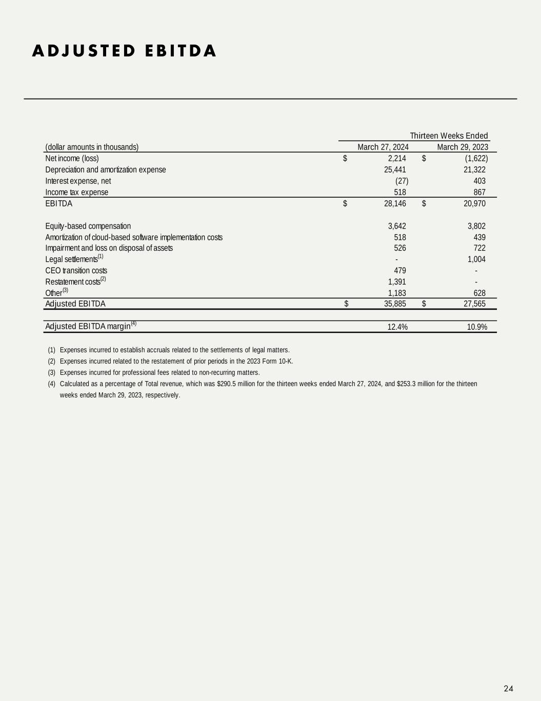 (dollar amounts in thousands) March 27, 2024 March 29, 2023 Net income (loss) 2,214$ (1,622)$ Depreciation and amortization expense 25,441 21,322 Interest expense, net (27) 403 Income tax expense 518 867 EBITDA 28,146$ 20,970$ Equity-based compensation 3,642 3,802 Amortization of cloud-based software implementation costs 518 439 Impairment and loss on disposal of assets 526 722 Legal settlements(1) - 1,004 CEO transition costs 479 - Restatement costs(2) 1,391 - Other(3) 1,183 628 Adjusted EBITDA 35,885$ 27,565$ Adjusted EBITDA margin(4) 12.4% 10.9% (1) (2) (3) (4) Calculated as a percentage of Total revenue, which was $290.5 million for the thirteen weeks ended March 27, 2024, and $253.3 million for the thirteen weeks ended March 29, 2023, respectively. Thirteen Weeks Ended Expenses incurred to establish accruals related to the settlements of legal matters. Expenses incurred related to the restatement of prior periods in the 2023 Form 10-K. Expenses incurred for professional fees related to non-recurring matters. A DJ U S T E D E B I T D A 24