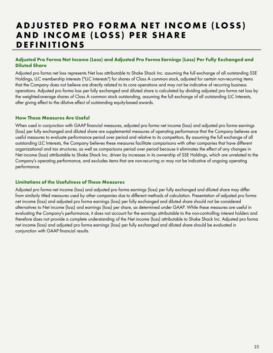 Adjusted Pro Forma Net Income (Loss) and Adjusted Pro Forma Earnings (Loss) Per Fully Exchanged and Diluted Share Adjusted pro forma net loss represents Net loss attributable to Shake Shack Inc. assuming the full exchange of all outstanding SSE Holdings, LLC membership interests ("LLC Interests") for shares of Class A common stock, adjusted for certain non-recurring items that the Company does not believe are directly related to its core operations and may not be indicative of recurring business operations. Adjusted pro forma loss per fully exchanged and diluted share is calculated by dividing adjusted pro forma net loss by the weighted-average shares of Class A common stock outstanding, assuming the full exchange of all outstanding LLC Interests, after giving effect to the dilutive effect of outstanding equity-based awards. How These Measures Are Useful When used in conjunction with GAAP financial measures, adjusted pro forma net income (loss) and adjusted pro forma earnings (loss) per fully exchanged and diluted share are supplemental measures of operating performance that the Company believes are useful measures to evaluate performance period over period and relative to its competitors. By assuming the full exchange of all outstanding LLC Interests, the Company believes these measures facilitate comparisons with other companies that have different organizational and tax structures, as well as comparisons period over period because it eliminates the effect of any changes in Net income (loss) attributable to Shake Shack Inc. driven by increases in its ownership of SSE Holdings, which are unrelated to the Company's operating performance, and excludes items that are non-recurring or may not be indicative of ongoing operating performance. Limitations of the Usefulness of These Measures Adjusted pro forma net income (loss) and adjusted pro forma earnings (loss) per fully exchanged and diluted share may differ from similarly titled measures used by other companies due to different methods of calculation. Presentation of adjusted pro forma net income (loss) and adjusted pro forma earnings (loss) per fully exchanged and diluted share should not be considered alternatives to Net income (loss) and earnings (loss) per share, as determined under GAAP. While these measures are useful in evaluating the Company's performance, it does not account for the earnings attributable to the non-controlling interest holders and therefore does not provide a complete understanding of the Net income (loss) attributable to Shake Shack Inc. Adjusted pro forma net income (loss) and adjusted pro forma earnings (loss) per fully exchanged and diluted share should be evaluated in conjunction with GAAP financial results. A DJ U S T E D P R O F O R M A N E T I N C O M E ( L O S S ) A N D I N C O M E ( L O S S ) P E R S H A R E D E F I N I T I O N S 25