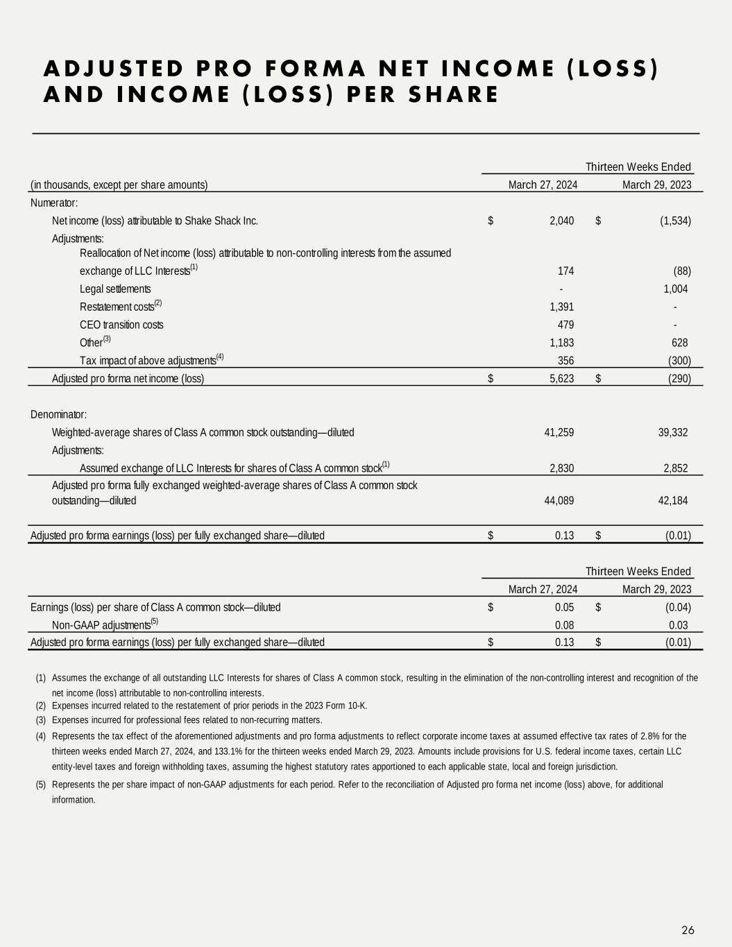 Adjusted pro forma net income (loss) represents Net income (loss) attributable to Shake Shack Inc. assuming the full exchange of all outstanding SSE Holdings, LLC membership interests ("LLC Interests") for shares of Class A common stock, adjusted for certain non-recurring items that the Company does not believe are directly related to its core operations and may not be indicative of recurring business operations. Adjusted pro forma earnings (loss) per fully exchanged and diluted share is calculated by dividing adjusted pro forma net income (loss) by the weighted-average shares of Class A common stock outstanding, assuming the full exchange of all outstanding LLC Interests, after giving effect to the dilutive effect of outstanding equity-based awards.