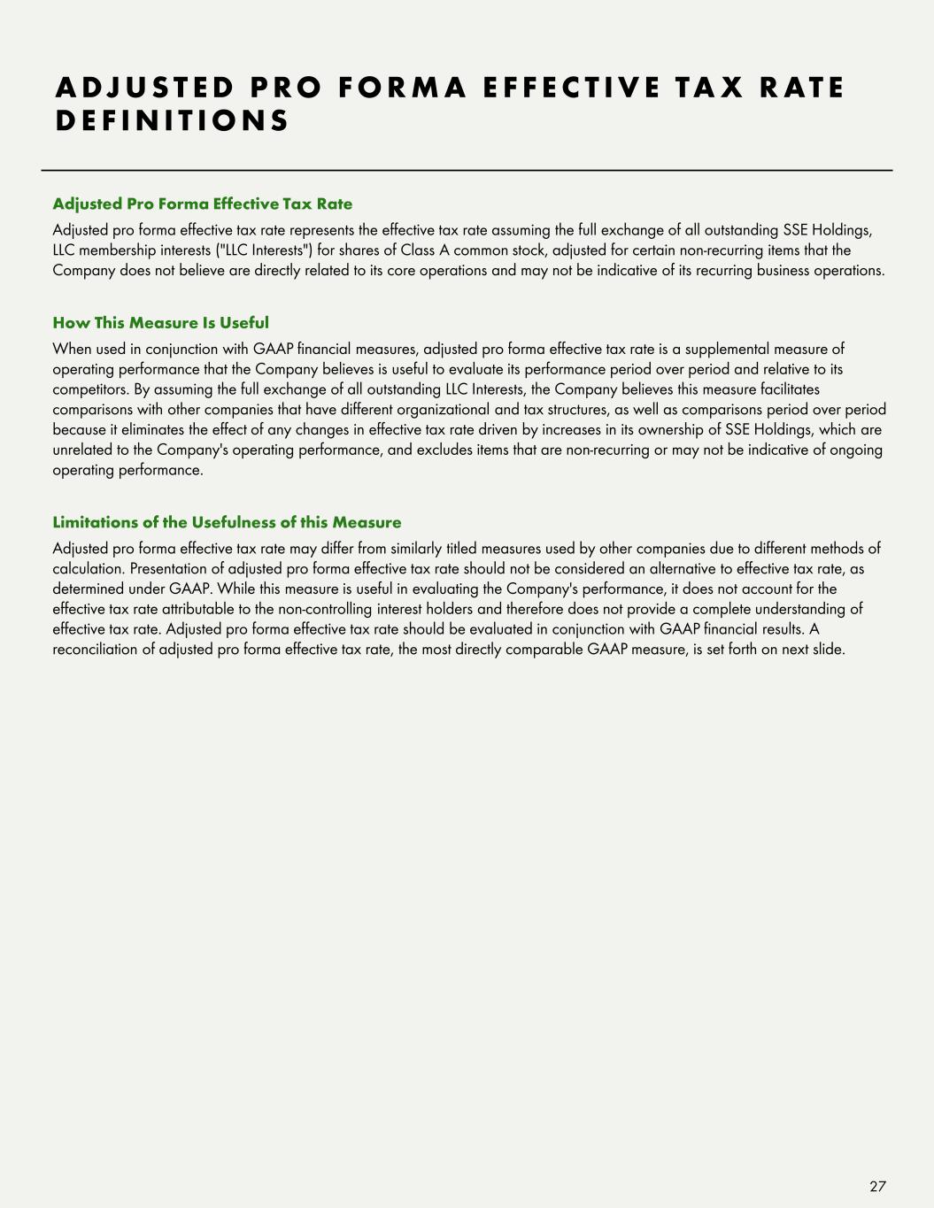 Adjusted Pro Forma Effective Tax Rate Adjusted pro forma effective tax rate represents the effective tax rate assuming the full exchange of all outstanding SSE Holdings, LLC membership interests ("LLC Interests") for shares of Class A common stock, adjusted for certain non-recurring items that the Company does not believe are directly related to its core operations and may not be indicative of its recurring business operations. How This Measure Is Useful When used in conjunction with GAAP financial measures, adjusted pro forma effective tax rate is a supplemental measure of operating performance that the Company believes is useful to evaluate its performance period over period and relative to its competitors. By assuming the full exchange of all outstanding LLC Interests, the Company believes this measure facilitates comparisons with other companies that have different organizational and tax structures, as well as comparisons period over period because it eliminates the effect of any changes in effective tax rate driven by increases in its ownership of SSE Holdings, which are unrelated to the Company's operating performance, and excludes items that are non-recurring or may not be indicative of ongoing operating performance. Limitations of the Usefulness of this Measure Adjusted pro forma effective tax rate may differ from similarly titled measures used by other companies due to different methods of calculation. Presentation of adjusted pro forma effective tax rate should not be considered an alternative to effective tax rate, as determined under GAAP. While this measure is useful in evaluating the Company's performance, it does not account for the effective tax rate attributable to the non-controlling interest holders and therefore does not provide a complete understanding of effective tax rate. Adjusted pro forma effective tax rate should be evaluated in conjunction with GAAP financial results. A reconciliation of adjusted pro forma effective tax rate, the most directly comparable GAAP measure, is set forth on next slide. A DJ U S T E D P R O F O R M A E F F E C T I V E TA X R AT E D E F I N I T I O N S 27
