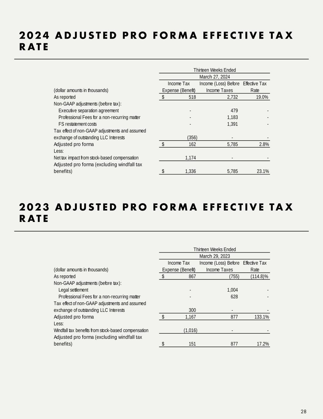 (4)Represents the tax effect of the aforementioned adjustments and pro forma adjustments to reflect corporate income taxes at assumed effective tax rates of 2.8% and 133.1% for the thirteen weeks ended March 27, 2024 and March 29, 2023, respectively. Amounts include provisions for U.S. federal income taxes, certain LLC entity-level taxes and foreign withholding taxes, assuming the highest statutory rates apportioned to each applicable state, local and foreign jurisdiction.