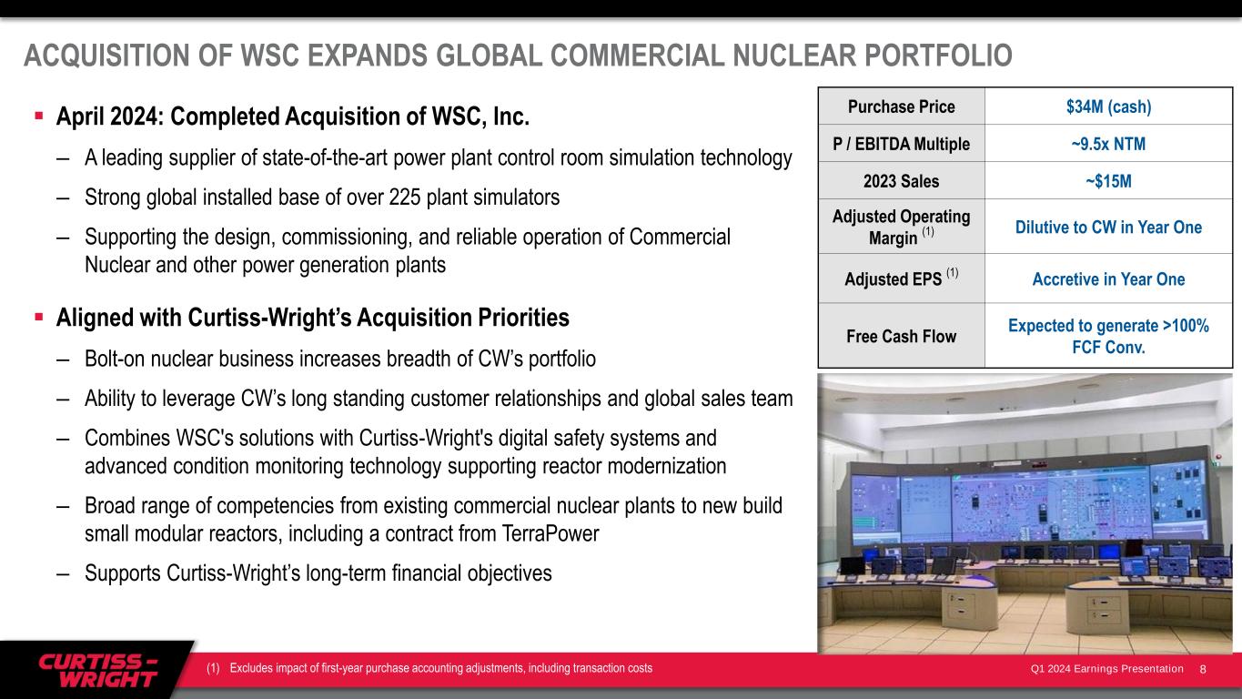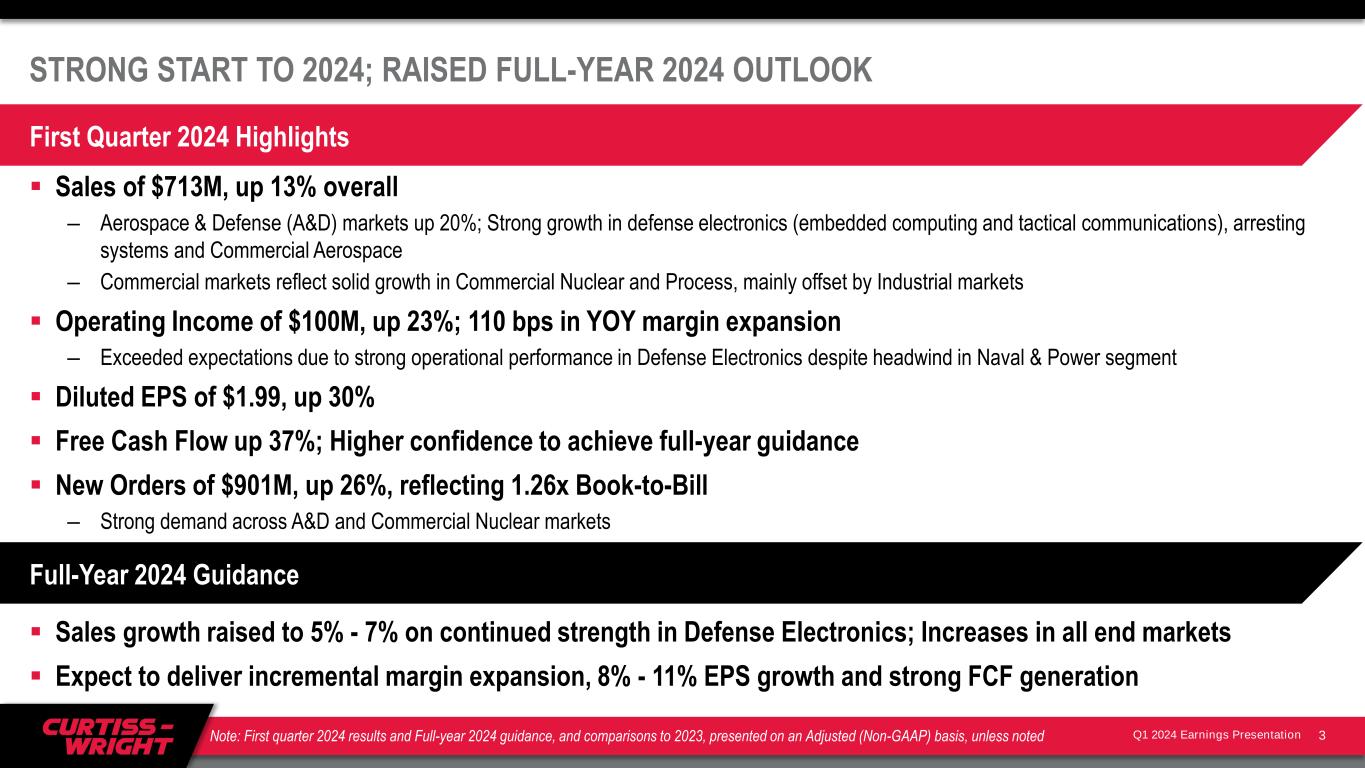 Q1 2024 Earnings Presentation SAFE HARBOR STATEMENT Please note that the information provided in this presentation is accurate as of the date of the original presentation. The presentation will remain posted on this website from one to twelve months following the initial presentation, but content will not be updated to reflect new information that may become available after the original presentation posting. The presentation contains forward-looking statements within the meaning of Section 27A of the Securities Act of 1933, as amended ("Securities Act"), Section 21E of the Securities Exchange Act of 1934, as amended ("Exchange Act"), and the Private Securities Litigation Reform Act of 1995. Such forward-looking statements only speak as of the date of this report and Curtiss-Wright Corporation assumes no obligation to update the information included in this report. Such forward-looking statements include, among other things, management's estimates of future performance, revenue and earnings, our management's growth objectives, our management’s ability to integrate our acquisition, and our management's ability to produce consistent operating improvements. These forward-looking statements are based on expectations as of the time the statements were made only, and are subject to a number of risks and uncertainties which could cause us to fail to achieve our then-current financial projections and other expectations, including the impact of a global pandemic or national epidemic. This presentation also includes certain non-GAAP financial measures with reconciliations to GAAP financial measures being made available in the earnings release and this presentation that are posted to our website and furnished with the SEC. We undertake no duty to update this information. More information about potential factors that could affect our business and financial results is included in our filings with the Securities and Exchange Commission, including our Annual Reports on Form 10-K and Quarterly Reports on Form 10-Q, including, among other sections, under the captions, "Risk Factors" and "Management's Discussion and Analysis of Financial Condition and Results of Operations," which is on file with the SEC and available at the SEC's website at www.sec.gov. 2