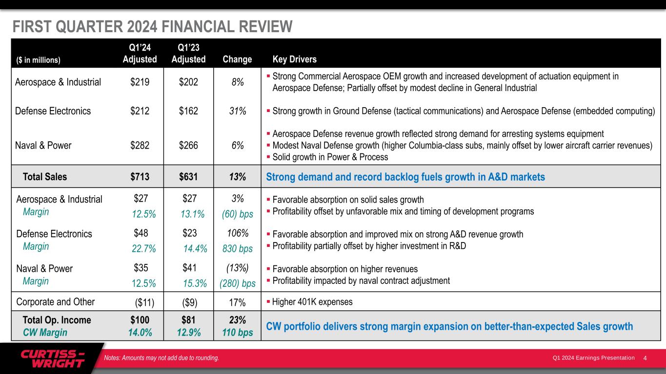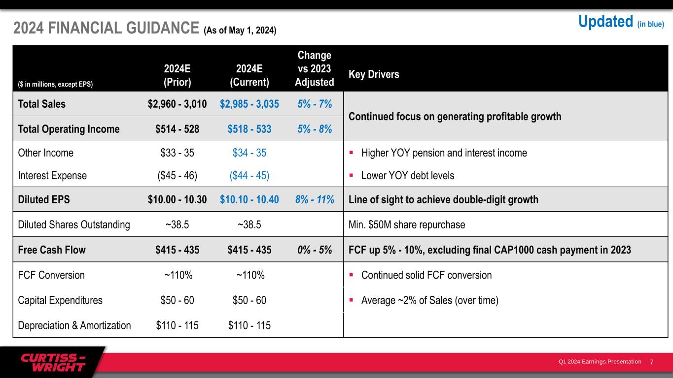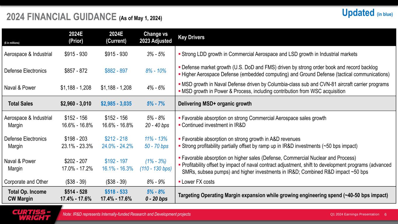 CURTISS-WRIGHT REPORTS FIRST QUARTER 2024 FINANCIAL RESULTS AND INCREASES FULL-YEAR 2024 GUIDANCE FOR SALES, OPERATING INCOME AND EPS