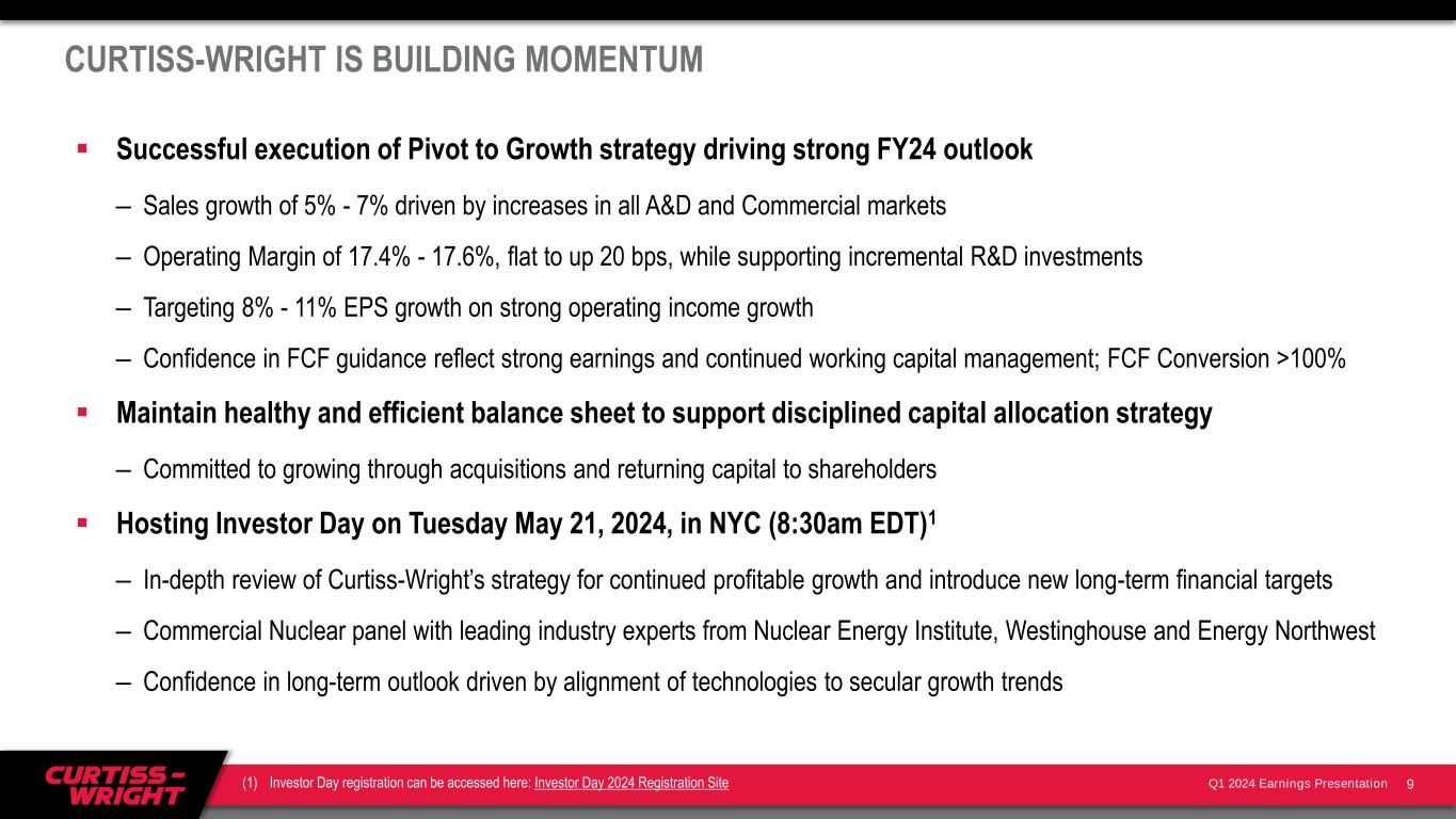 "Based upon our strong overall start to the year and the continued strength in our order book, we have increased our full-year 2024 sales, operating income and diluted EPS guidance as we continue to successfully execute on our Pivot to Growth strategy. We now expect to deliver total sales growth of 5% to 7%, including the contribution from our recent commercial nuclear acquisition of WSC, Inc., continued operating margin expansion while increasing R&D investments, and diluted EPS growth of 8% to 11%, while we maintain our outlook for strong free cash flow conversion well in excess of 100%. We look forward to discussing our alignment with the favorable secular growth trends driving our end markets and our new long-term financial targets at our upcoming investor day on May 21st."