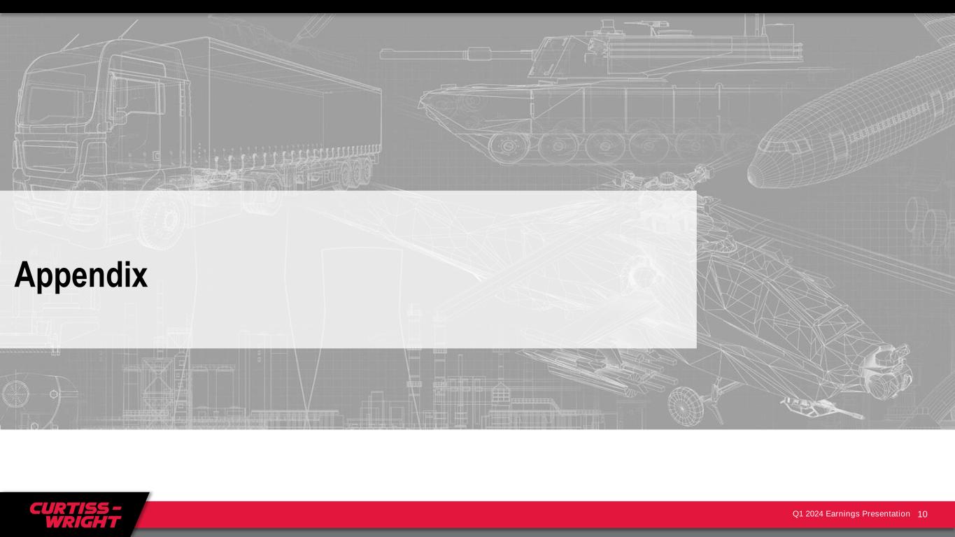 Q1 2024 Earnings Presentation CURTISS-WRIGHT IS BUILDING MOMENTUM 9 ▪ Successful execution of Pivot to Growth strategy driving strong FY24 outlook – Sales growth of 5% - 7% driven by increases in all A&D and Commercial markets – Operating Margin of 17.4% - 17.6%, flat to up 20 bps, while supporting incremental R&D investments – Targeting 8% - 11% EPS growth on strong operating income growth – Confidence in FCF guidance reflect strong earnings and continued working capital management; FCF Conversion >100% ▪ Maintain healthy and efficient balance sheet to support disciplined capital allocation strategy – Committed to growing through acquisitions and returning capital to shareholders ▪ Hosting Investor Day on Tuesday May 21, 2024, in NYC (8:30am EDT)1 – In-depth review of Curtiss-Wright’s strategy for continued profitable growth and introduce new long-term financial targets – Commercial Nuclear panel with leading industry experts from Nuclear Energy Institute, Westinghouse and Energy Northwest – Confidence in long-term outlook driven by alignment of technologies to secular growth trends (1) Investor Day registration can be accessed here: Investor Day 2024 Registration Site