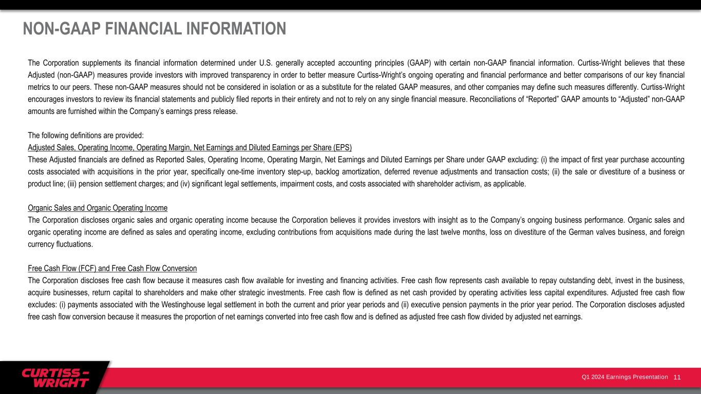 Q1 2024 Earnings Presentation NON-GAAP FINANCIAL INFORMATION The Corporation supplements its financial information determined under U.S. generally accepted accounting principles (GAAP) with certain non-GAAP financial information. Curtiss-Wright believes that these Adjusted (non-GAAP) measures provide investors with improved transparency in order to better measure Curtiss-Wright’s ongoing operating and financial performance and better comparisons of our key financial metrics to our peers. These non-GAAP measures should not be considered in isolation or as a substitute for the related GAAP measures, and other companies may define such measures differently. Curtiss-Wright encourages investors to review its financial statements and publicly filed reports in their entirety and not to rely on any single financial measure. Reconciliations of “Reported” GAAP amounts to “Adjusted” non-GAAP amounts are furnished within the Company’s earnings press release. The following definitions are provided: Adjusted Sales, Operating Income, Operating Margin, Net Earnings and Diluted Earnings per Share (EPS) These Adjusted financials are defined as Reported Sales, Operating Income, Operating Margin, Net Earnings and Diluted Earnings per Share under GAAP excluding: (i) the impact of first year purchase accounting costs associated with acquisitions in the prior year, specifically one-time inventory step-up, backlog amortization, deferred revenue adjustments and transaction costs; (ii) the sale or divestiture of a business or product line; (iii) pension settlement charges; and (iv) significant legal settlements, impairment costs, and costs associated with shareholder activism, as applicable. Organic Sales and Organic Operating Income The Corporation discloses organic sales and organic operating income because the Corporation believes it provides investors with insight as to the Company’s ongoing business performance. Organic sales and organic operating income are defined as sales and operating income, excluding contributions from acquisitions made during the last twelve months, loss on divestiture of the German valves business, and foreign currency fluctuations. Free Cash Flow (FCF) and Free Cash Flow Conversion The Corporation discloses free cash flow because it measures cash flow available for investing and financing activities. Free cash flow represents cash available to repay outstanding debt, invest in the business, acquire businesses, return capital to shareholders and make other strategic investments. Free cash flow is defined as net cash provided by operating activities less capital expenditures. Adjusted free cash flow excludes: (i) payments associated with the Westinghouse legal settlement in both the current and prior year periods and (ii) executive pension payments in the prior year period. The Corporation discloses adjusted free cash flow conversion because it measures the proportion of net earnings converted into free cash flow and is defined as adjusted free cash flow divided by adjusted net earnings. 11