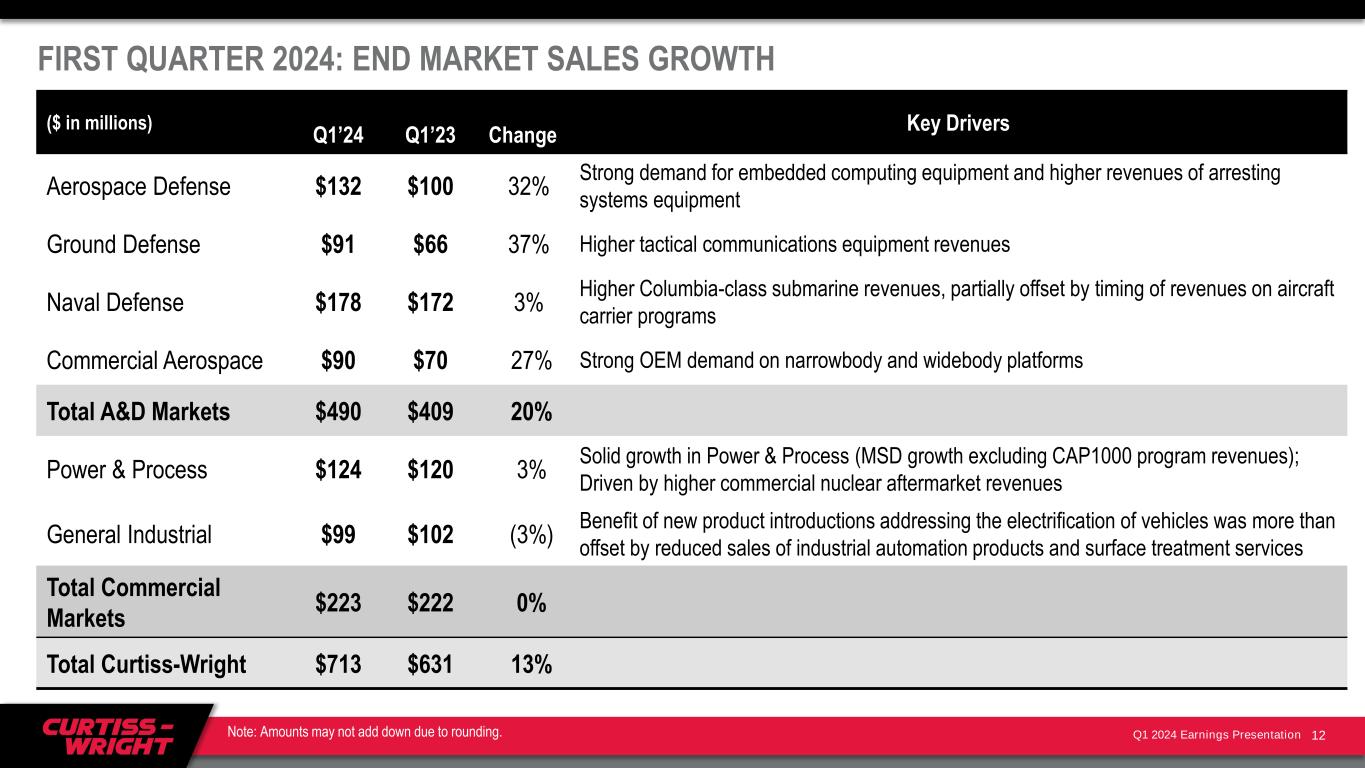 Q1 2024 Earnings Presentation FIRST QUARTER 2024: END MARKET SALES GROWTH ($ in millions) Q1’24 Q1’23 Change Key Drivers Aerospace Defense $132 $100 32% Strong demand for embedded computing equipment and higher revenues of arresting systems equipment Ground Defense $91 $66 37% Higher tactical communications equipment revenues Naval Defense $178 $172 3% Higher Columbia-class submarine revenues, partially offset by timing of revenues on aircraft carrier programs Commercial Aerospace $90 $70 27% Strong OEM demand on narrowbody and widebody platforms Total A&D Markets $490 $409 20% Power & Process $124 $120 3% Solid growth in Power & Process (MSD growth excluding CAP1000 program revenues); Driven by higher commercial nuclear aftermarket revenues General Industrial $99 $102 (3%) Benefit of new product introductions addressing the electrification of vehicles was more than offset by reduced sales of industrial automation products and surface treatment services Total Commercial Markets $223 $222 0% Total Curtiss-Wright $713 $631 13% 12Note: Amounts may not add down due to rounding.