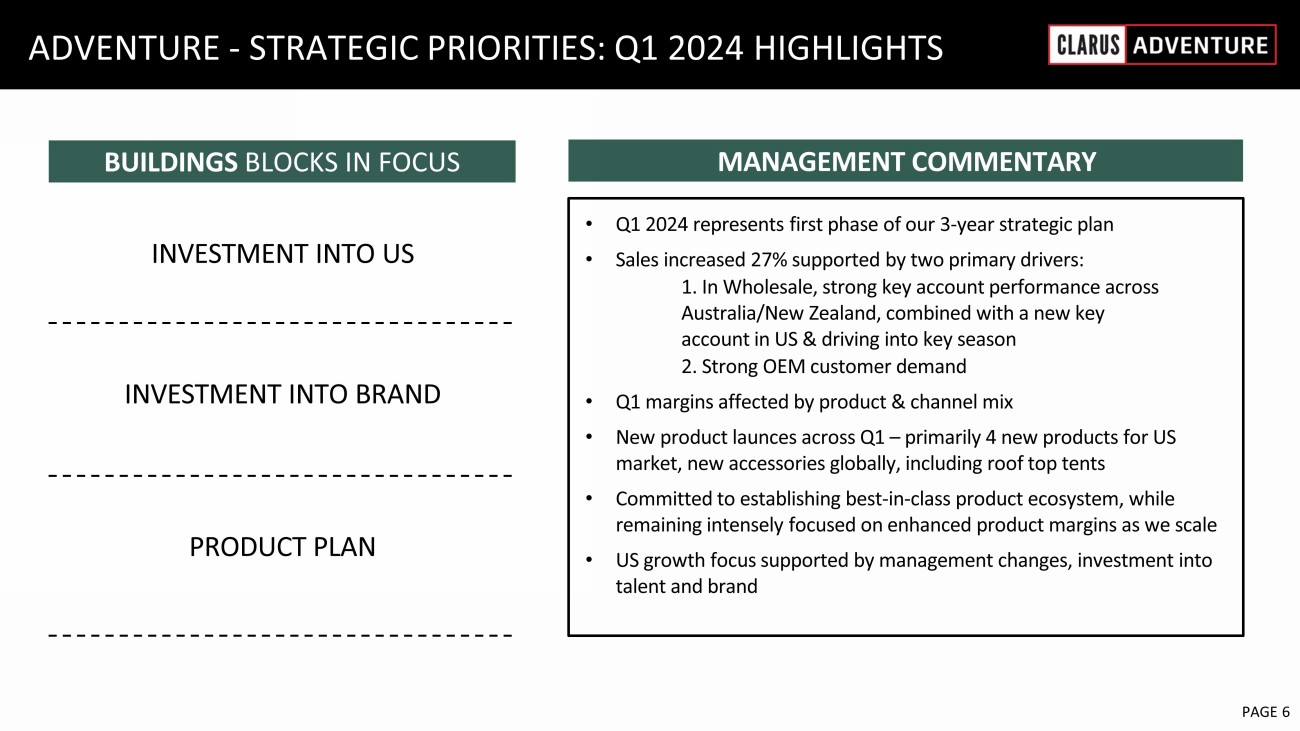 6 February 2023 PAGE 6 ADVENTURE - STRATEGIC PRIORITIES: Q1 2024 HIGHLIGHTS • Q1 2024 represents first phase of our 3 - year strategic plan • Sales increased 27% supported by two primary drivers: 1. In Wholesale, strong key account performance across Australia/New Zealand, combined with a new key account in US & driving into key season 2. Strong OEM customer demand • Q1 margins affected by product & channel mix • New product launces across Q1 – primarily 4 new products for US market, new accessories globally, including roof top tents • Committed to establishing best - in - class product ecosystem, while remaining intensely focused on enhanced product margins as we scale • US growth focus supported by management changes, investment into talent and brand MANAGEMENT COMMENTARY BUILDINGS BLOCKS IN FOCUS INVESTMENT INTO US INVESTMENT INTO BRAND PRODUCT PLAN