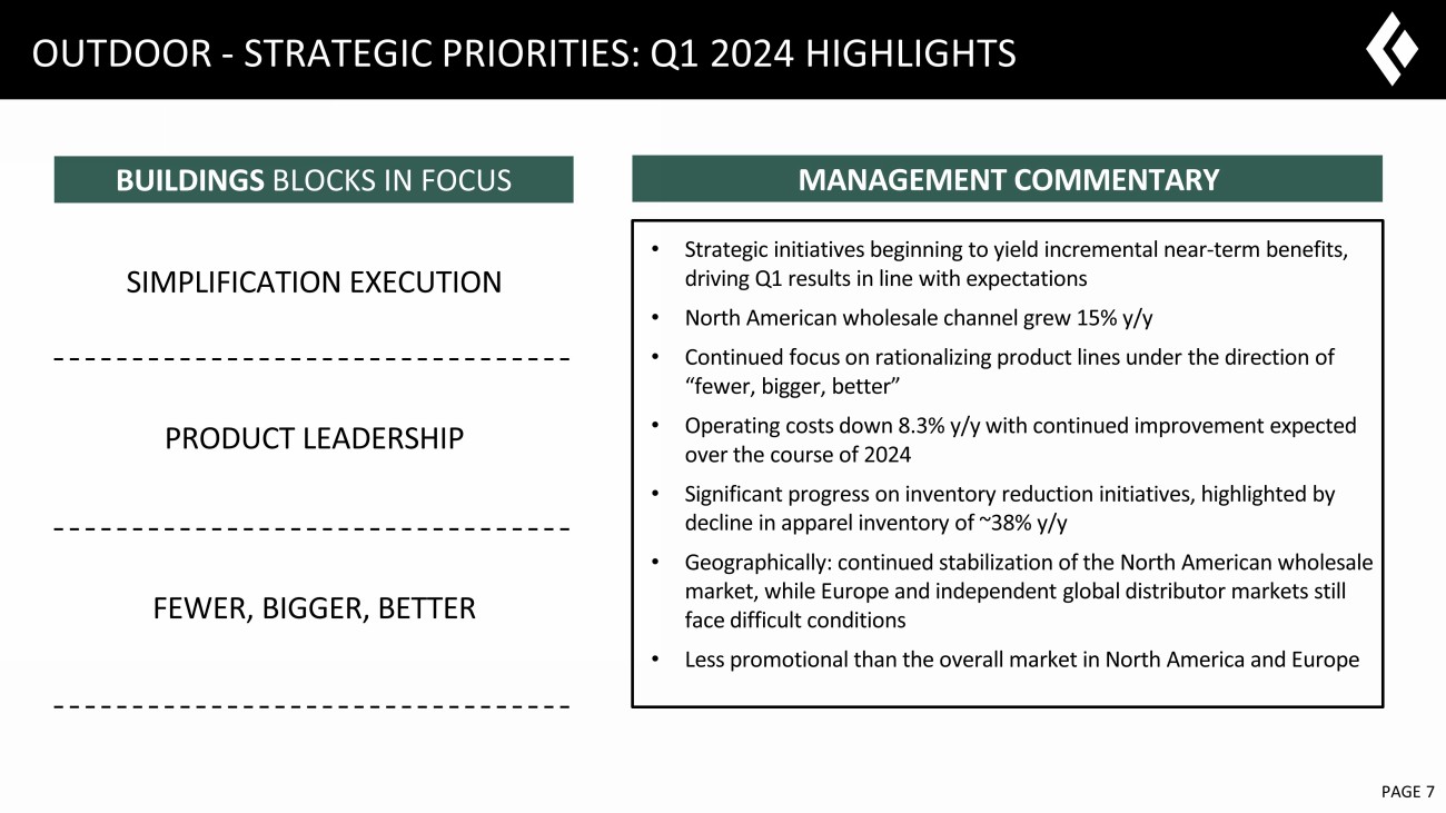 6 February 2023 PAGE 7 OUTDOOR - STRATEGIC PRIORITIES: Q1 2024 HIGHLIGHTS • Strategic initiatives beginning to yield incremental near - term benefits, driving Q1 results in line with expectations • North American wholesale channel grew 15% y/y • Continued focus on rationalizing product lines under the direction of “fewer, bigger, better” • Operating costs down 8.3% y/y with continued improvement expected over the course of 2024 • Significant progress on inventory reduction initiatives, highlighted by decline in apparel inventory of ~38% y/y • Geographically: continued stabilization of the North American wholesale market, while Europe and independent global distributor markets still face difficult conditions • L ess promotional than the overall market in North America and Europe MANAGEMENT COMMENTARY BUILDINGS BLOCKS IN FOCUS SIMPLIFICATION EXECUTION PRODUCT LEADERSHIP FEWER, BIGGER, BETTER