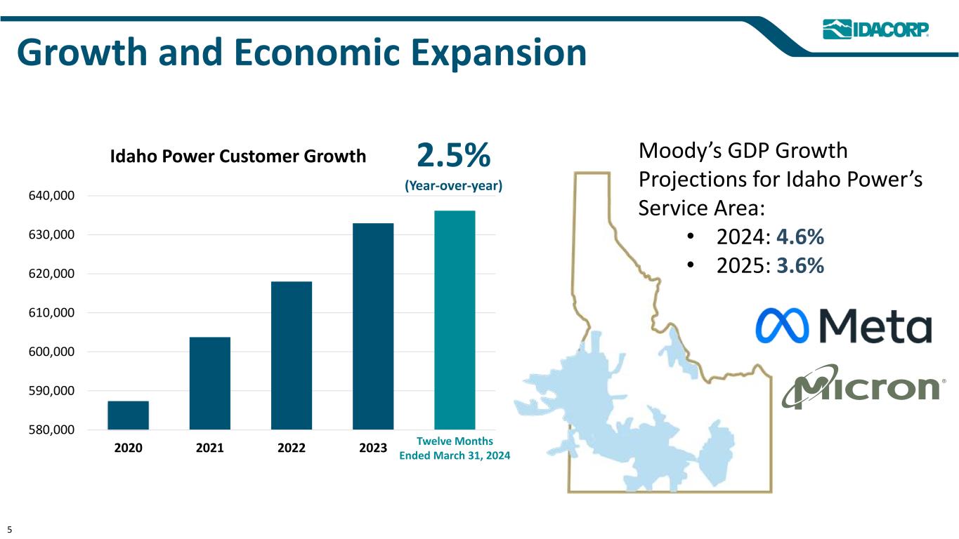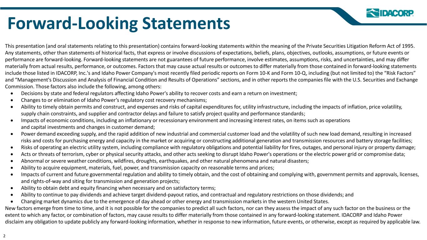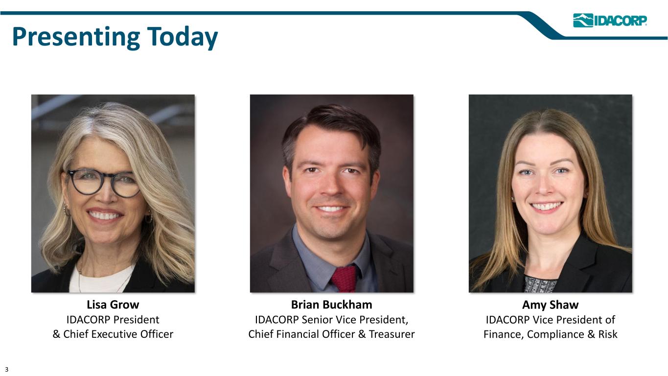 Forward-Looking Statements This presentation (and oral statements relating to this presentation) contains forward-looking statements within the meaning of the Private Securities Litigation Reform Act of 1995. Any statements, other than statements of historical facts, that express or involve discussions of expectations, beliefs, plans, objectives, outlooks, assumptions, or future events or performance are forward-looking. Forward-looking statements are not guarantees of future performance, involve estimates, assumptions, risks, and uncertainties, and may differ materially from actual results, performance, or outcomes. Factors that may cause actual results or outcomes to differ materially from those contained in forward-looking statements include those listed in IDACORP, Inc.'s and Idaho Power Company's most recently filed periodic reports on Form 10-K and Form 10-Q, including (but not limited to) the “Risk Factors” and “Management's Discussion and Analysis of Financial Condition and Results of Operations” sections, and in other reports the companies file with the U.S. Securities and Exchange Commission. Those factors also include the following, among others: • Decisions by state and federal regulators affecting Idaho Power's ability to recover costs and earn a return on investment; • Changes to or elimination of Idaho Power’s regulatory cost recovery mechanisms; • Ability to timely obtain permits and construct, and expenses and risks of capital expenditures for, utility infrastructure, including the impacts of inflation, price volatility, supply chain constraints, and supplier and contractor delays and failure to satisfy project quality and performance standards; • Impacts of economic conditions, including an inflationary or recessionary environment and increasing interest rates, on items such as operations and capital investments and changes in customer demand; • Power demand exceeding supply, and the rapid addition of new industrial and commercial customer load and the volatility of such new load demand, resulting in increased risks and costs for purchasing energy and capacity in the market or acquiring or constructing additional generation and transmission resources and battery storage facilities; • Risks of operating an electric utility system, including compliance with regulatory obligations and potential liability for fires, outages, and personal injury or property damage; • Acts or threats of terrorism, cyber or physical security attacks, and other acts seeking to disrupt Idaho Power's operations or the electric power grid or compromise data; • Abnormal or severe weather conditions, wildfires, droughts, earthquakes, and other natural phenomena and natural disasters; • Ability to acquire equipment, materials, fuel, power, and transmission capacity on reasonable terms and prices; • Impacts of current and future governmental regulation and ability to timely obtain, and the cost of obtaining and complying with, government permits and approvals, licenses, and rights-of-way and siting for transmission and generation projects; • Ability to obtain debt and equity financing when necessary and on satisfactory terms; • Ability to continue to pay dividends and achieve target dividend-payout ratios, and contractual and regulatory restrictions on those dividends; and • Changing market dynamics due to the emergence of day ahead or other energy and transmission markets in the western United States. New factors emerge from time to time, and it is not possible for the companies to predict all such factors, nor can they assess the impact of any such factor on the business or the extent to which any factor, or combination of factors, may cause results to differ materially from those contained in any forward-looking statement. IDACORP and Idaho Power disclaim any obligation to update publicly any forward-looking information, whether in response to new information, future events, or otherwise, except as required by applicable law. 2
