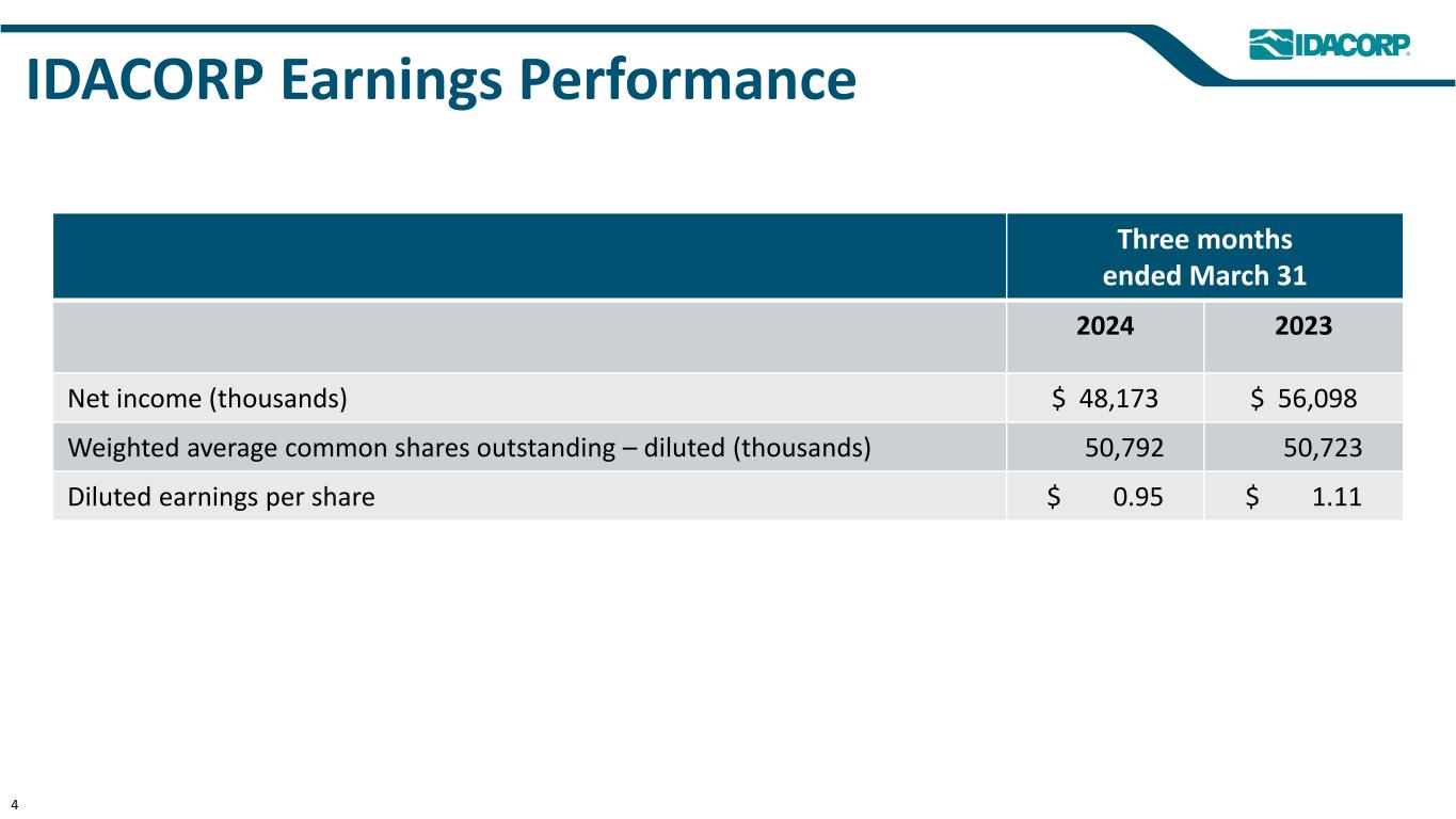 IDACORP Earnings Performance Three months ended March 31 2024 2023 Net income (thousands) $ 48,173 $ 56,098 Weighted average common shares outstanding – diluted (thousands) 50,792 50,723 Diluted earnings per share $ 0.95 $ 1.11 4