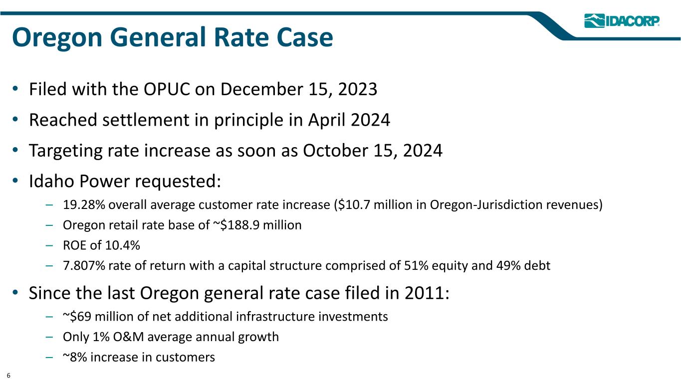 Growth and Economic Expansion Moody’s GDP Growth Projections for Idaho Power’s Service Area: • 2024: 4.6% • 2025: 3.6% 5 2.5% (Year-over-year) Idaho Power Customer Growth 580,000 590,000 600,000 610,000 620,000 630,000 640,000 2020 2021 2022 2023 Twelve Months Ended March 31, 2024