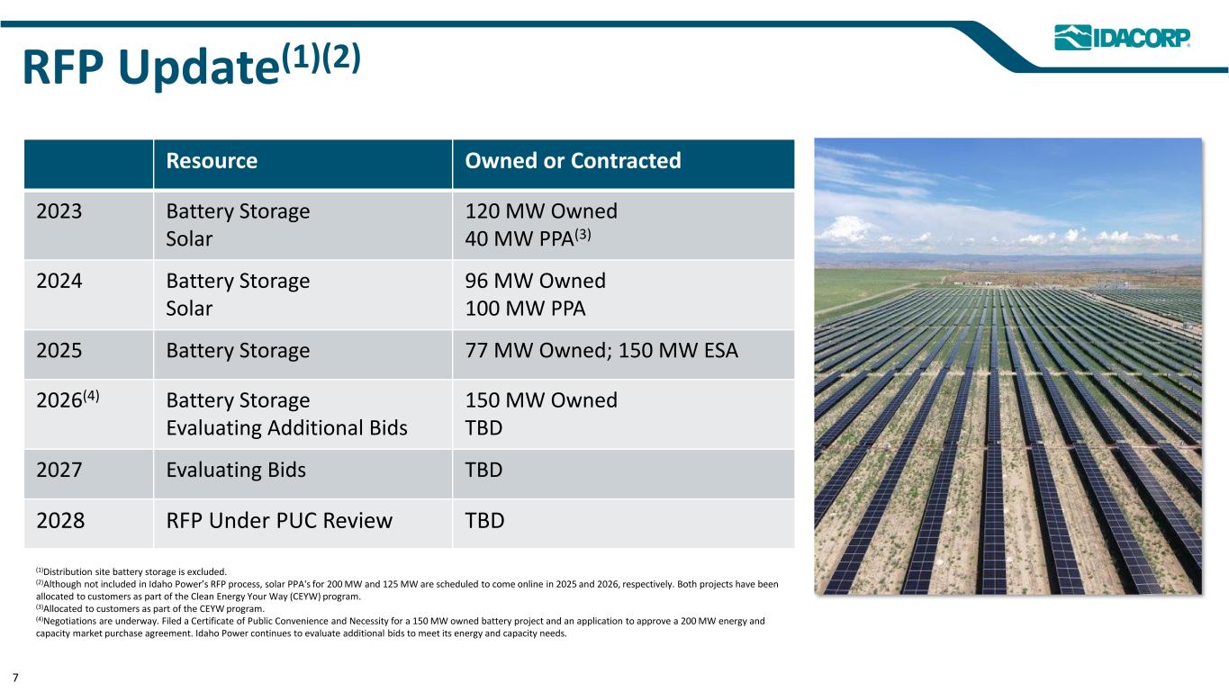 • Filed with the OPUC on December 15, 2023 • Reached settlement in principle in April 2024 • Targeting rate increase as soon as October 15, 2024 • Idaho Power requested: – 19.28% overall average customer rate increase ($10.7 million in Oregon-Jurisdiction revenues) – Oregon retail rate base of ~$188.9 million – ROE of 10.4% – 7.807% rate of return with a capital structure comprised of 51% equity and 49% debt • Since the last Oregon general rate case filed in 2011: – ~$69 million of net additional infrastructure investments – Only 1% O&M average annual growth – ~8% increase in customers Oregon General Rate Case 6