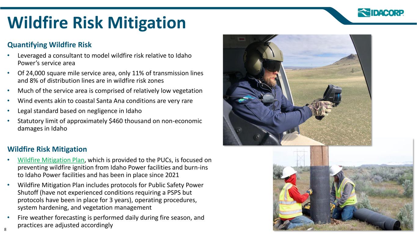 RFP Update(1)(2) Resource Owned or Contracted 2023 Battery Storage Solar 120 MW Owned 40 MW PPA(3) 2024 Battery Storage Solar 96 MW Owned 100 MW PPA 2025 Battery Storage 77 MW Owned; 150 MW ESA 2026(4) Battery Storage Evaluating Additional Bids 150 MW Owned TBD 2027 Evaluating Bids TBD 2028 RFP Under PUC Review TBD 7 (1)Distribution site battery storage is excluded. (2)Although not included in Idaho Power’s RFP process, solar PPA's for 200 MW and 125 MW are scheduled to come online in 2025 and 2026, respectively. Both projects have been allocated to customers as part of the Clean Energy Your Way (CEYW) program. (3)Allocated to customers as part of the CEYW program. (4)Negotiations are underway. Filed a Certificate of Public Convenience and Necessity for a 150 MW owned battery project and an application to approve a 200 MW energy and capacity market purchase agreement. Idaho Power continues to evaluate additional bids to meet its energy and capacity needs.