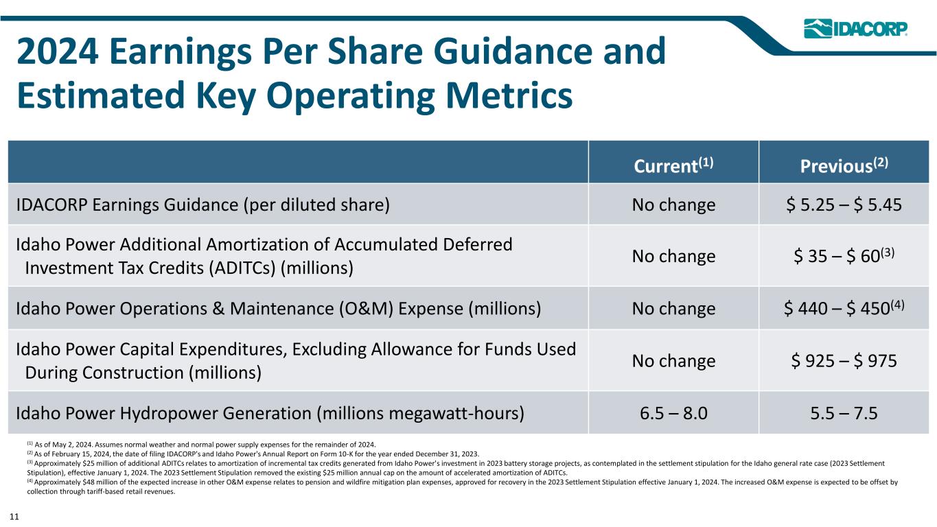 2024 Earnings Per Share Guidance and Estimated Key Operating Metrics Current(1) Previous(2) IDACORP Earnings Guidance (per diluted share) No change $ 5.25 – $ 5.45 Idaho Power Additional Amortization of Accumulated Deferred Investment Tax Credits (ADITCs) (millions) No change $ 35 – $ 60(3) Idaho Power Operations & Maintenance (O&M) Expense (millions) No change $ 440 – $ 450(4) Idaho Power Capital Expenditures, Excluding Allowance for Funds Used During Construction (millions) No change $ 925 – $ 975 Idaho Power Hydropower Generation (millions megawatt-hours) 6.5 – 8.0 5.5 – 7.5 (1) As of May 2, 2024. Assumes normal weather and normal power supply expenses for the remainder of 2024. (2) As of February 15, 2024, the date of filing IDACORP's and Idaho Power's Annual Report on Form 10-K for the year ended December 31, 2023. (3) Approximately $25 million of additional ADITCs relates to amortization of incremental tax credits generated from Idaho Power's investment in 2023 battery storage projects, as contemplated in the settlement stipulation for the Idaho general rate case (2023 Settlement Stipulation), effective January 1, 2024. The 2023 Settlement Stipulation removed the existing $25 million annual cap on the amount of accelerated amortization of ADITCs. (4) Approximately $48 million of the expected increase in other O&M expense relates to pension and wildfire mitigation plan expenses, approved for recovery in the 2023 Settlement Stipulation effective January 1, 2024. The increased O&M expense is expected to be offset by collection through tariff-based retail revenues. 11