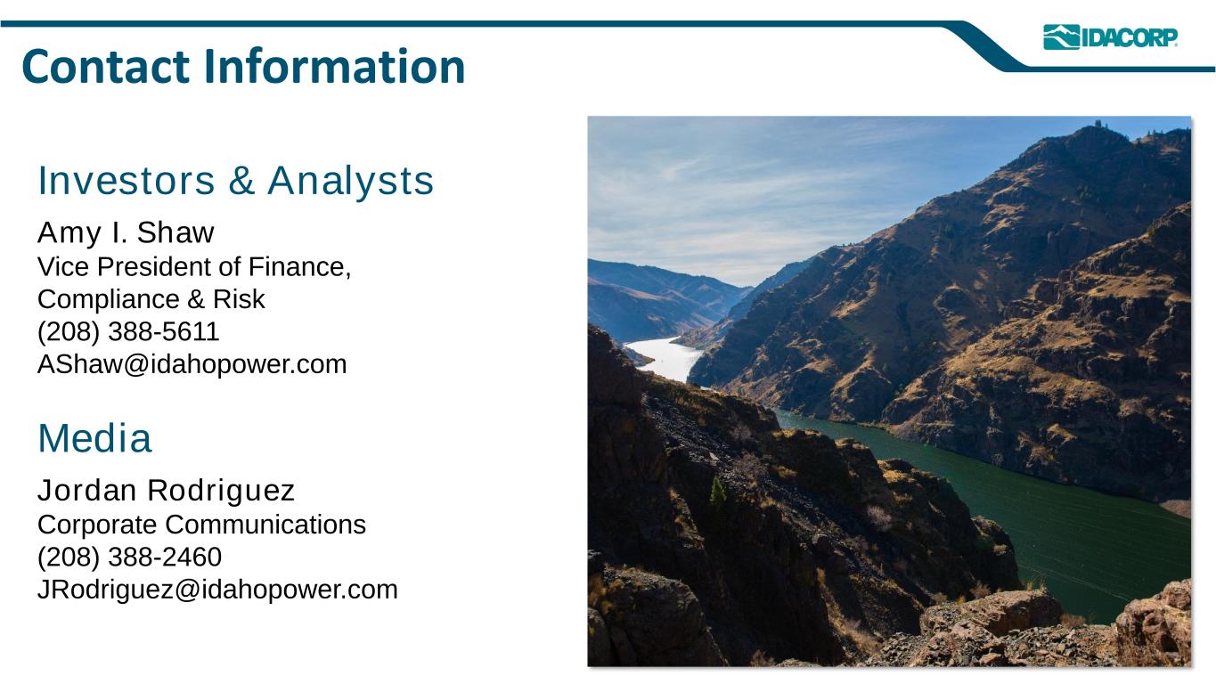 Contact Information Amy I. Shaw Vice President of Finance, Compliance & Risk (208) 388-5611 AShaw@idahopower.com Investors & Analysts Jordan Rodriguez Corporate Communications (208) 388-2460 JRodriguez@idahopower.com Media
