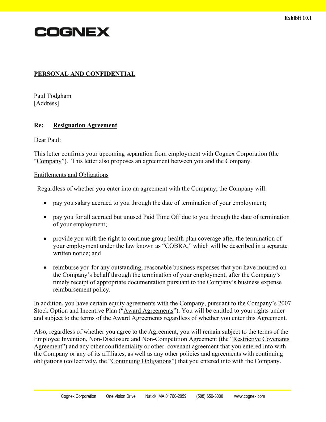 Exhibit 10.1 Cognex Corporation One Vision Drive Natick, MA 01760-2059 (508) 650-3000 www.cognex.com PERSONAL AND CONFIDENTIAL Paul Todgham [Address] Re: Resignation Agreement Dear Paul: This letter confirms your upcoming separation from employment with Cognex Corporation (the “Company”). This letter also proposes an agreement between you and the Company. Entitlements and Obligations Regardless of whether you enter into an agreement with the Company, the Company will: • pay you salary accrued to you through the date of termination of your employment; • pay you for all accrued but unused Paid Time Off due to you through the date of termination of your employment; • provide you with the right to continue group health plan coverage after the termination of your employment under the law known as “COBRA,” which will be described in a separate written notice; and • reimburse you for any outstanding, reasonable business expenses that you have incurred on the Company’s behalf through the termination of your employment, after the Company’s timely receipt of appropriate documentation pursuant to the Company’s business expense reimbursement policy. In addition, you have certain equity agreements with the Company, pursuant to the Company’s 2007 Stock Option and Incentive Plan (“Award Agreements”). You will be entitled to your rights under and subject to the terms of the Award Agreements regardless of whether you enter this Agreement. Also, regardless of whether you agree to the Agreement, you will remain subject to the terms of the Employee Invention, Non-Disclosure and Non-Competition Agreement (the “Restrictive Covenants Agreement”) and any other confidentiality or other covenant agreement that you entered into with the Company or any of its affiliates, as well as any other policies and agreements with continuing obligations (collectively, the “Continuing Obligations”) that you entered into with the Company.