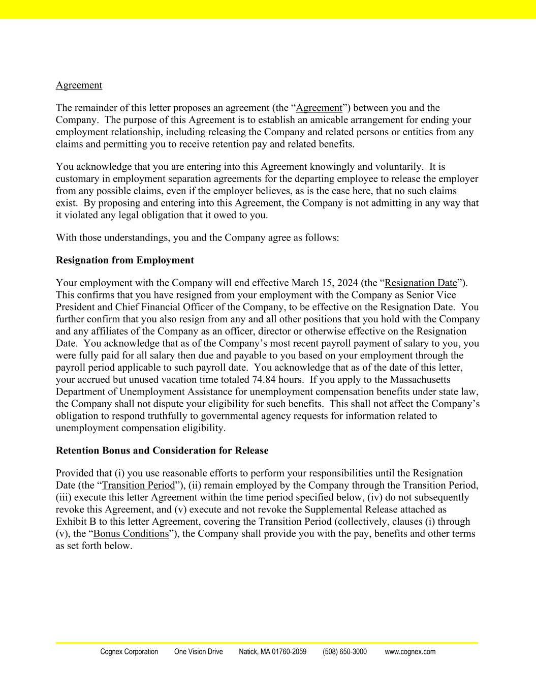 Cognex Corporation One Vision Drive Natick, MA 01760-2059 (508) 650-3000 www.cognex.com Agreement The remainder of this letter proposes an agreement (the “Agreement”) between you and the Company. The purpose of this Agreement is to establish an amicable arrangement for ending your employment relationship, including releasing the Company and related persons or entities from any claims and permitting you to receive retention pay and related benefits. You acknowledge that you are entering into this Agreement knowingly and voluntarily. It is customary in employment separation agreements for the departing employee to release the employer from any possible claims, even if the employer believes, as is the case here, that no such claims exist. By proposing and entering into this Agreement, the Company is not admitting in any way that it violated any legal obligation that it owed to you. With those understandings, you and the Company agree as follows: Resignation from Employment Your employment with the Company will end effective March 15, 2024 (the “Resignation Date”). This confirms that you have resigned from your employment with the Company as Senior Vice President and Chief Financial Officer of the Company, to be effective on the Resignation Date. You further confirm that you also resign from any and all other positions that you hold with the Company and any affiliates of the Company as an officer, director or otherwise effective on the Resignation Date. You acknowledge that as of the Company’s most recent payroll payment of salary to you, you were fully paid for all salary then due and payable to you based on your employment through the payroll period applicable to such payroll date. You acknowledge that as of the date of this letter, your accrued but unused vacation time totaled 74.84 hours. If you apply to the Massachusetts Department of Unemployment Assistance for unemployment compensation benefits under state law, the Company shall not dispute your eligibility for such benefits. This shall not affect the Company’s obligation to respond truthfully to governmental agency requests for information related to unemployment compensation eligibility. Retention Bonus and Consideration for Release Provided that (i) you use reasonable efforts to perform your responsibilities until the Resignation Date (the “Transition Period”), (ii) remain employed by the Company through the Transition Period, (iii) execute this letter Agreement within the time period specified below, (iv) do not subsequently revoke this Agreement, and (v) execute and not revoke the Supplemental Release attached as Exhibit B to this letter Agreement, covering the Transition Period (collectively, clauses (i) through (v), the “Bonus Conditions”), the Company shall provide you with the pay, benefits and other terms as set forth below.