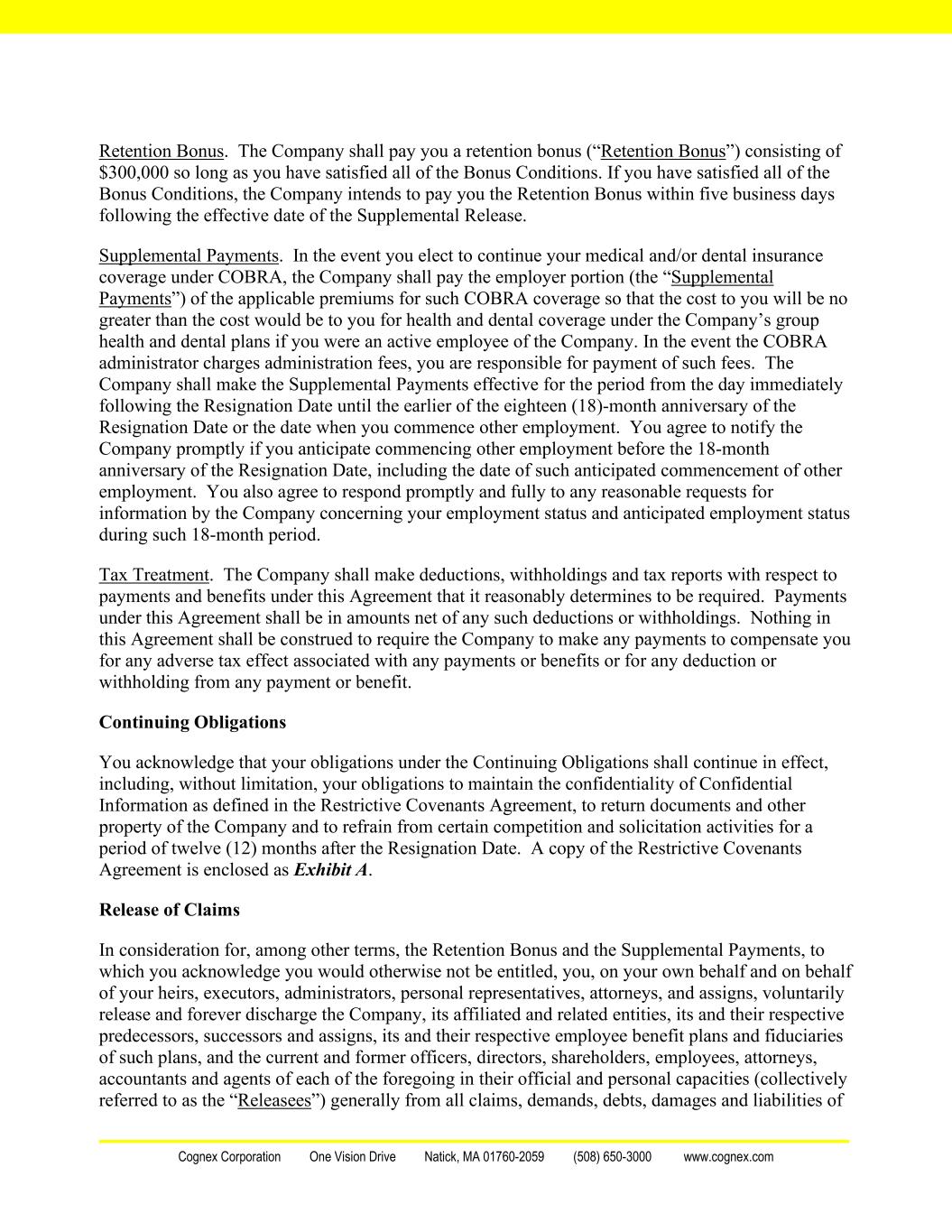 Cognex Corporation One Vision Drive Natick, MA 01760-2059 (508) 650-3000 www.cognex.com Retention Bonus. The Company shall pay you a retention bonus (“Retention Bonus”) consisting of $300,000 so long as you have satisfied all of the Bonus Conditions. If you have satisfied all of the Bonus Conditions, the Company intends to pay you the Retention Bonus within five business days following the effective date of the Supplemental Release. Supplemental Payments. In the event you elect to continue your medical and/or dental insurance coverage under COBRA, the Company shall pay the employer portion (the “Supplemental Payments”) of the applicable premiums for such COBRA coverage so that the cost to you will be no greater than the cost would be to you for health and dental coverage under the Company’s group health and dental plans if you were an active employee of the Company. In the event the COBRA administrator charges administration fees, you are responsible for payment of such fees. The Company shall make the Supplemental Payments effective for the period from the day immediately following the Resignation Date until the earlier of the eighteen (18)-month anniversary of the Resignation Date or the date when you commence other employment. You agree to notify the Company promptly if you anticipate commencing other employment before the 18-month anniversary of the Resignation Date, including the date of such anticipated commencement of other employment. You also agree to respond promptly and fully to any reasonable requests for information by the Company concerning your employment status and anticipated employment status during such 18-month period. Tax Treatment. The Company shall make deductions, withholdings and tax reports with respect to payments and benefits under this Agreement that it reasonably determines to be required. Payments under this Agreement shall be in amounts net of any such deductions or withholdings. Nothing in this Agreement shall be construed to require the Company to make any payments to compensate you for any adverse tax effect associated with any payments or benefits or for any deduction or withholding from any payment or benefit. Continuing Obligations You acknowledge that your obligations under the Continuing Obligations shall continue in effect, including, without limitation, your obligations to maintain the confidentiality of Confidential Information as defined in the Restrictive Covenants Agreement, to return documents and other property of the Company and to refrain from certain competition and solicitation activities for a period of twelve (12) months after the Resignation Date. A copy of the Restrictive Covenants Agreement is enclosed as Exhibit A. Release of Claims In consideration for, among other terms, the Retention Bonus and the Supplemental Payments, to which you acknowledge you would otherwise not be entitled, you, on your own behalf and on behalf of your heirs, executors, administrators, personal representatives, attorneys, and assigns, voluntarily release and forever discharge the Company, its affiliated and related entities, its and their respective predecessors, successors and assigns, its and their respective employee benefit plans and fiduciaries of such plans, and the current and former officers, directors, shareholders, employees, attorneys, accountants and agents of each of the foregoing in their official and personal capacities (collectively referred to as the “Releasees”) generally from all claims, demands, debts, damages and liabilities of
