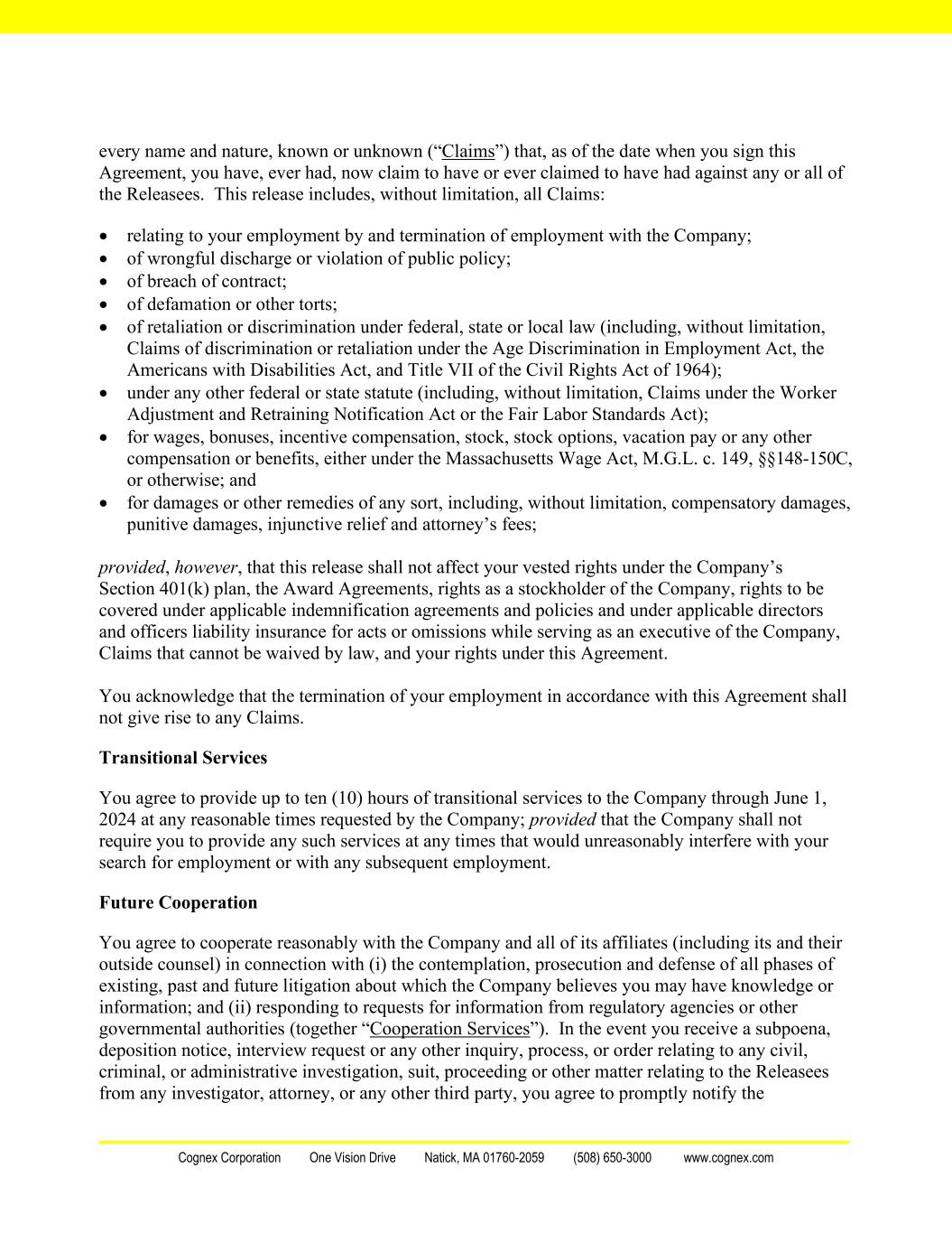 Cognex Corporation One Vision Drive Natick, MA 01760-2059 (508) 650-3000 www.cognex.com every name and nature, known or unknown (“Claims”) that, as of the date when you sign this Agreement, you have, ever had, now claim to have or ever claimed to have had against any or all of the Releasees. This release includes, without limitation, all Claims: • relating to your employment by and termination of employment with the Company; • of wrongful discharge or violation of public policy; • of breach of contract; • of defamation or other torts; • of retaliation or discrimination under federal, state or local law (including, without limitation, Claims of discrimination or retaliation under the Age Discrimination in Employment Act, the Americans with Disabilities Act, and Title VII of the Civil Rights Act of 1964); • under any other federal or state statute (including, without limitation, Claims under the Worker Adjustment and Retraining Notification Act or the Fair Labor Standards Act); • for wages, bonuses, incentive compensation, stock, stock options, vacation pay or any other compensation or benefits, either under the Massachusetts Wage Act, M.G.L. c. 149, §§148-150C, or otherwise; and • for damages or other remedies of any sort, including, without limitation, compensatory damages, punitive damages, injunctive relief and attorney’s fees; provided, however, that this release shall not affect your vested rights under the Company’s Section 401(k) plan, the Award Agreements, rights as a stockholder of the Company, rights to be covered under applicable indemnification agreements and policies and under applicable directors and officers liability insurance for acts or omissions while serving as an executive of the Company, Claims that cannot be waived by law, and your rights under this Agreement. You acknowledge that the termination of your employment in accordance with this Agreement shall not give rise to any Claims. Transitional Services You agree to provide up to ten (10) hours of transitional services to the Company through June 1, 2024 at any reasonable times requested by the Company; provided that the Company shall not require you to provide any such services at any times that would unreasonably interfere with your search for employment or with any subsequent employment. Future Cooperation You agree to cooperate reasonably with the Company and all of its affiliates (including its and their outside counsel) in connection with (i) the contemplation, prosecution and defense of all phases of existing, past and future litigation about which the Company believes you may have knowledge or information; and (ii) responding to requests for information from regulatory agencies or other governmental authorities (together “Cooperation Services”). In the event you receive a subpoena, deposition notice, interview request or any other inquiry, process, or order relating to any civil, criminal, or administrative investigation, suit, proceeding or other matter relating to the Releasees from any investigator, attorney, or any other third party, you agree to promptly notify the