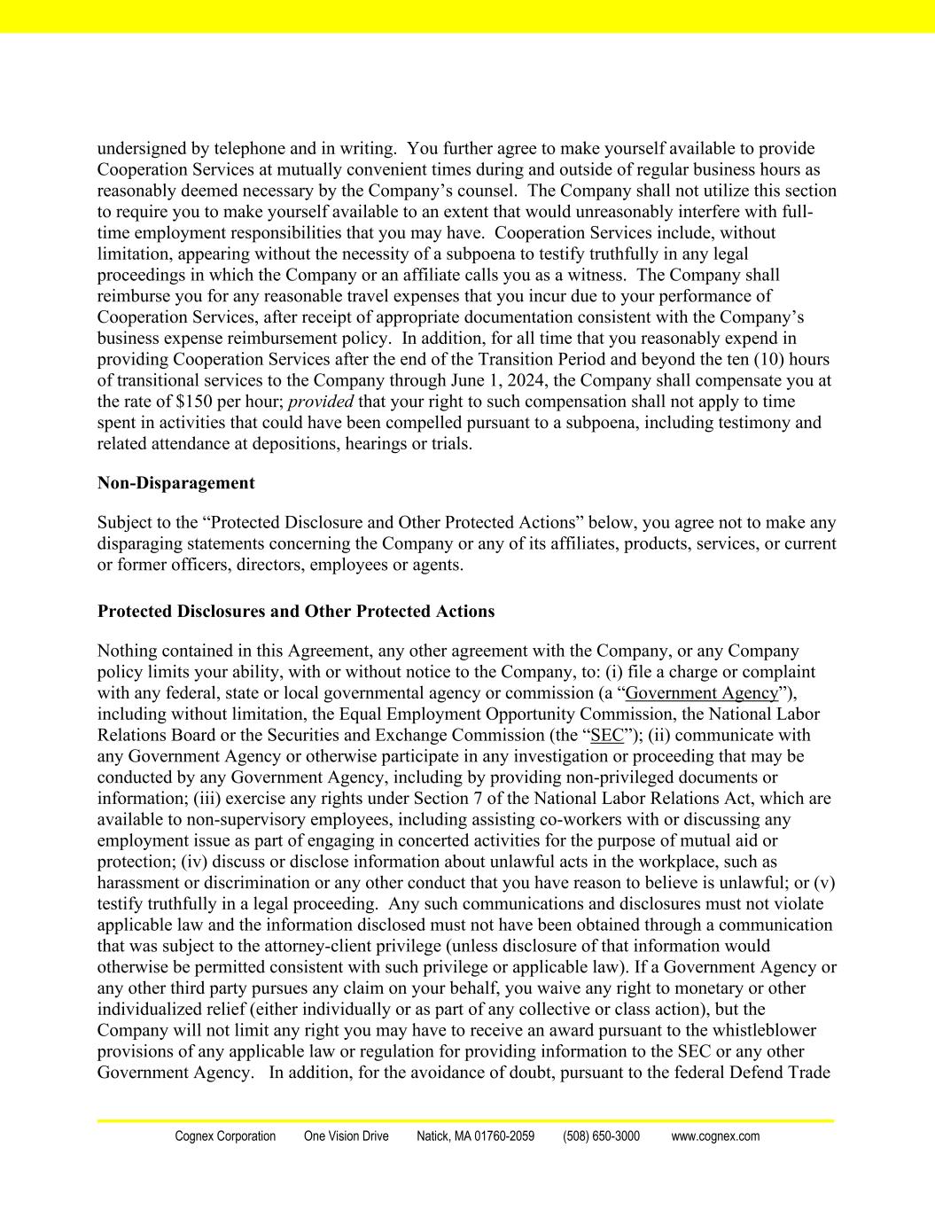 Cognex Corporation One Vision Drive Natick, MA 01760-2059 (508) 650-3000 www.cognex.com undersigned by telephone and in writing. You further agree to make yourself available to provide Cooperation Services at mutually convenient times during and outside of regular business hours as reasonably deemed necessary by the Company’s counsel. The Company shall not utilize this section to require you to make yourself available to an extent that would unreasonably interfere with full- time employment responsibilities that you may have. Cooperation Services include, without limitation, appearing without the necessity of a subpoena to testify truthfully in any legal proceedings in which the Company or an affiliate calls you as a witness. The Company shall reimburse you for any reasonable travel expenses that you incur due to your performance of Cooperation Services, after receipt of appropriate documentation consistent with the Company’s business expense reimbursement policy. In addition, for all time that you reasonably expend in providing Cooperation Services after the end of the Transition Period and beyond the ten (10) hours of transitional services to the Company through June 1, 2024, the Company shall compensate you at the rate of $150 per hour; provided that your right to such compensation shall not apply to time spent in activities that could have been compelled pursuant to a subpoena, including testimony and related attendance at depositions, hearings or trials. Non-Disparagement Subject to the “Protected Disclosure and Other Protected Actions” below, you agree not to make any disparaging statements concerning the Company or any of its affiliates, products, services, or current or former officers, directors, employees or agents. Protected Disclosures and Other Protected Actions Nothing contained in this Agreement, any other agreement with the Company, or any Company policy limits your ability, with or without notice to the Company, to: (i) file a charge or complaint with any federal, state or local governmental agency or commission (a “Government Agency”), including without limitation, the Equal Employment Opportunity Commission, the National Labor Relations Board or the Securities and Exchange Commission (the “SEC”); (ii) communicate with any Government Agency or otherwise participate in any investigation or proceeding that may be conducted by any Government Agency, including by providing non-privileged documents or information; (iii) exercise any rights under Section 7 of the National Labor Relations Act, which are available to non-supervisory employees, including assisting co-workers with or discussing any employment issue as part of engaging in concerted activities for the purpose of mutual aid or protection; (iv) discuss or disclose information about unlawful acts in the workplace, such as harassment or discrimination or any other conduct that you have reason to believe is unlawful; or (v) testify truthfully in a legal proceeding. Any such communications and disclosures must not violate applicable law and the information disclosed must not have been obtained through a communication that was subject to the attorney-client privilege (unless disclosure of that information would otherwise be permitted consistent with such privilege or applicable law). If a Government Agency or any other third party pursues any claim on your behalf, you waive any right to monetary or other individualized relief (either individually or as part of any collective or class action), but the Company will not limit any right you may have to receive an award pursuant to the whistleblower provisions of any applicable law or regulation for providing information to the SEC or any other Government Agency. In addition, for the avoidance of doubt, pursuant to the federal Defend Trade