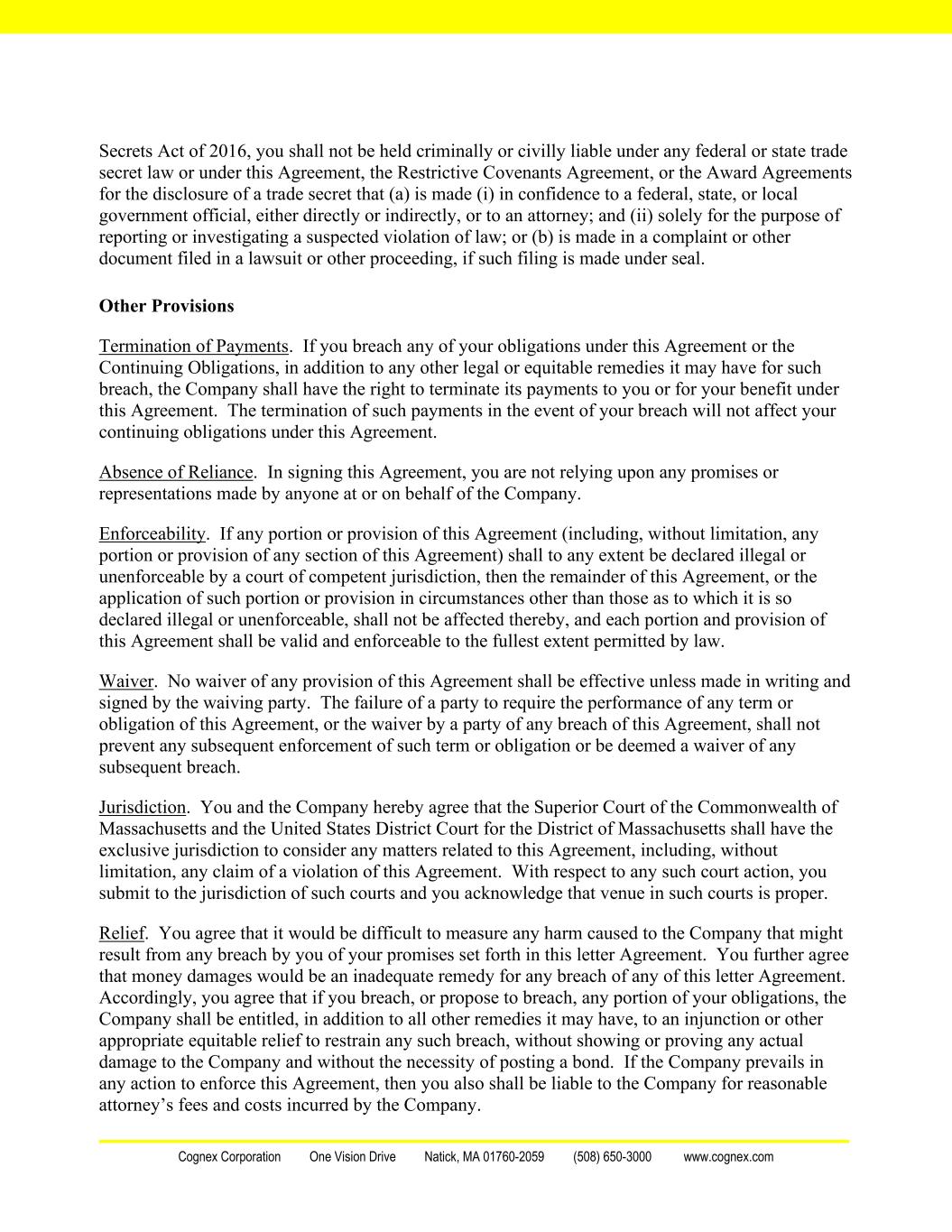 Cognex Corporation One Vision Drive Natick, MA 01760-2059 (508) 650-3000 www.cognex.com Secrets Act of 2016, you shall not be held criminally or civilly liable under any federal or state trade secret law or under this Agreement, the Restrictive Covenants Agreement, or the Award Agreements for the disclosure of a trade secret that (a) is made (i) in confidence to a federal, state, or local government official, either directly or indirectly, or to an attorney; and (ii) solely for the purpose of reporting or investigating a suspected violation of law; or (b) is made in a complaint or other document filed in a lawsuit or other proceeding, if such filing is made under seal. Other Provisions Termination of Payments. If you breach any of your obligations under this Agreement or the Continuing Obligations, in addition to any other legal or equitable remedies it may have for such breach, the Company shall have the right to terminate its payments to you or for your benefit under this Agreement. The termination of such payments in the event of your breach will not affect your continuing obligations under this Agreement. Absence of Reliance. In signing this Agreement, you are not relying upon any promises or representations made by anyone at or on behalf of the Company. Enforceability. If any portion or provision of this Agreement (including, without limitation, any portion or provision of any section of this Agreement) shall to any extent be declared illegal or unenforceable by a court of competent jurisdiction, then the remainder of this Agreement, or the application of such portion or provision in circumstances other than those as to which it is so declared illegal or unenforceable, shall not be affected thereby, and each portion and provision of this Agreement shall be valid and enforceable to the fullest extent permitted by law. Waiver. No waiver of any provision of this Agreement shall be effective unless made in writing and signed by the waiving party. The failure of a party to require the performance of any term or obligation of this Agreement, or the waiver by a party of any breach of this Agreement, shall not prevent any subsequent enforcement of such term or obligation or be deemed a waiver of any subsequent breach. Jurisdiction. You and the Company hereby agree that the Superior Court of the Commonwealth of Massachusetts and the United States District Court for the District of Massachusetts shall have the exclusive jurisdiction to consider any matters related to this Agreement, including, without limitation, any claim of a violation of this Agreement. With respect to any such court action, you submit to the jurisdiction of such courts and you acknowledge that venue in such courts is proper. Relief. You agree that it would be difficult to measure any harm caused to the Company that might result from any breach by you of your promises set forth in this letter Agreement. You further agree that money damages would be an inadequate remedy for any breach of any of this letter Agreement. Accordingly, you agree that if you breach, or propose to breach, any portion of your obligations, the Company shall be entitled, in addition to all other remedies it may have, to an injunction or other appropriate equitable relief to restrain any such breach, without showing or proving any actual damage to the Company and without the necessity of posting a bond. If the Company prevails in any action to enforce this Agreement, then you also shall be liable to the Company for reasonable attorney’s fees and costs incurred by the Company.