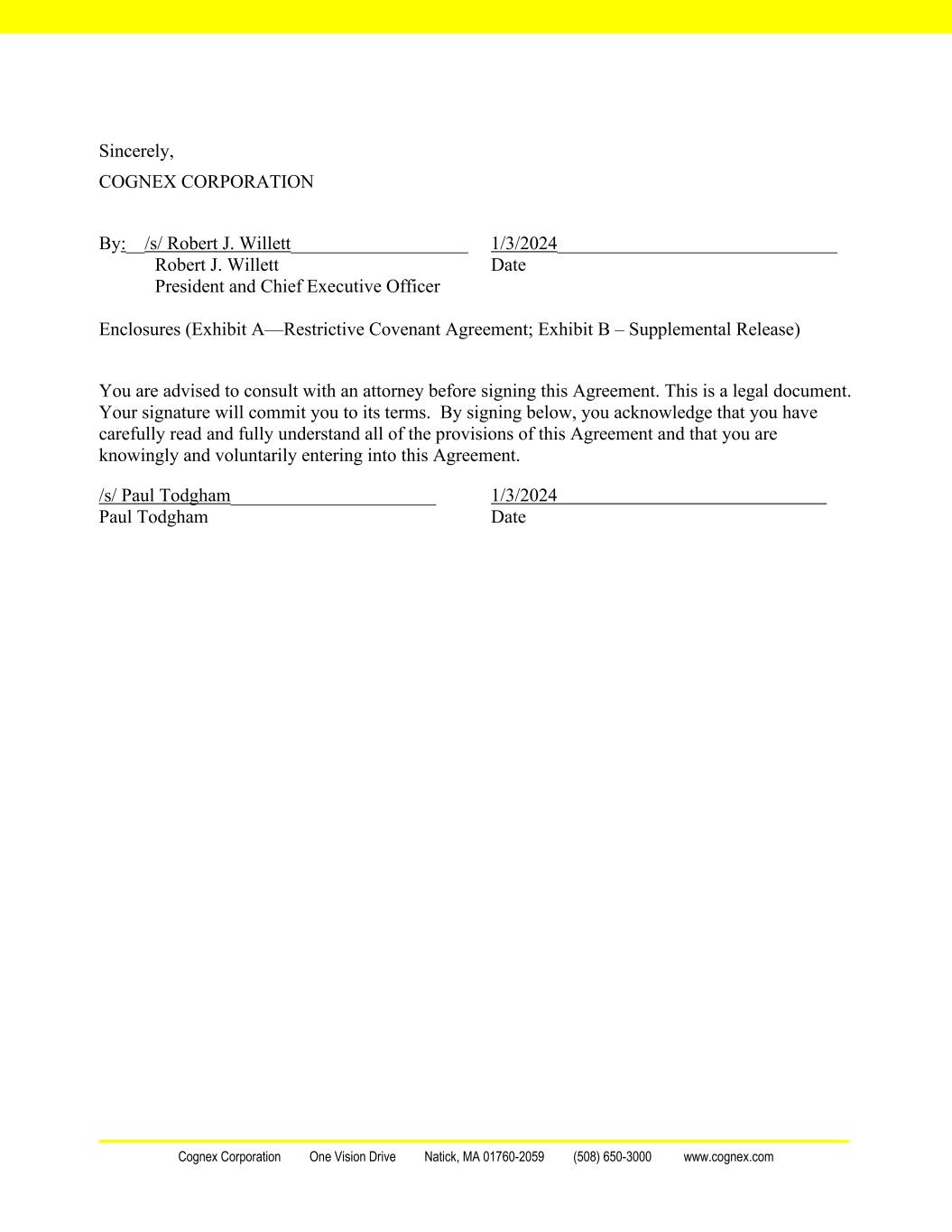 Cognex Corporation One Vision Drive Natick, MA 01760-2059 (508) 650-3000 www.cognex.com Sincerely, COGNEX CORPORATION By:__/s/ Robert J. Willett___________________ 1/3/2024______________________________ Robert J. Willett Date President and Chief Executive Officer Enclosures (Exhibit A—Restrictive Covenant Agreement; Exhibit B – Supplemental Release) You are advised to consult with an attorney before signing this Agreement. This is a legal document. Your signature will commit you to its terms. By signing below, you acknowledge that you have carefully read and fully understand all of the provisions of this Agreement and that you are knowingly and voluntarily entering into this Agreement. /s/ Paul Todgham______________________ 1/3/2024 Paul Todgham Date