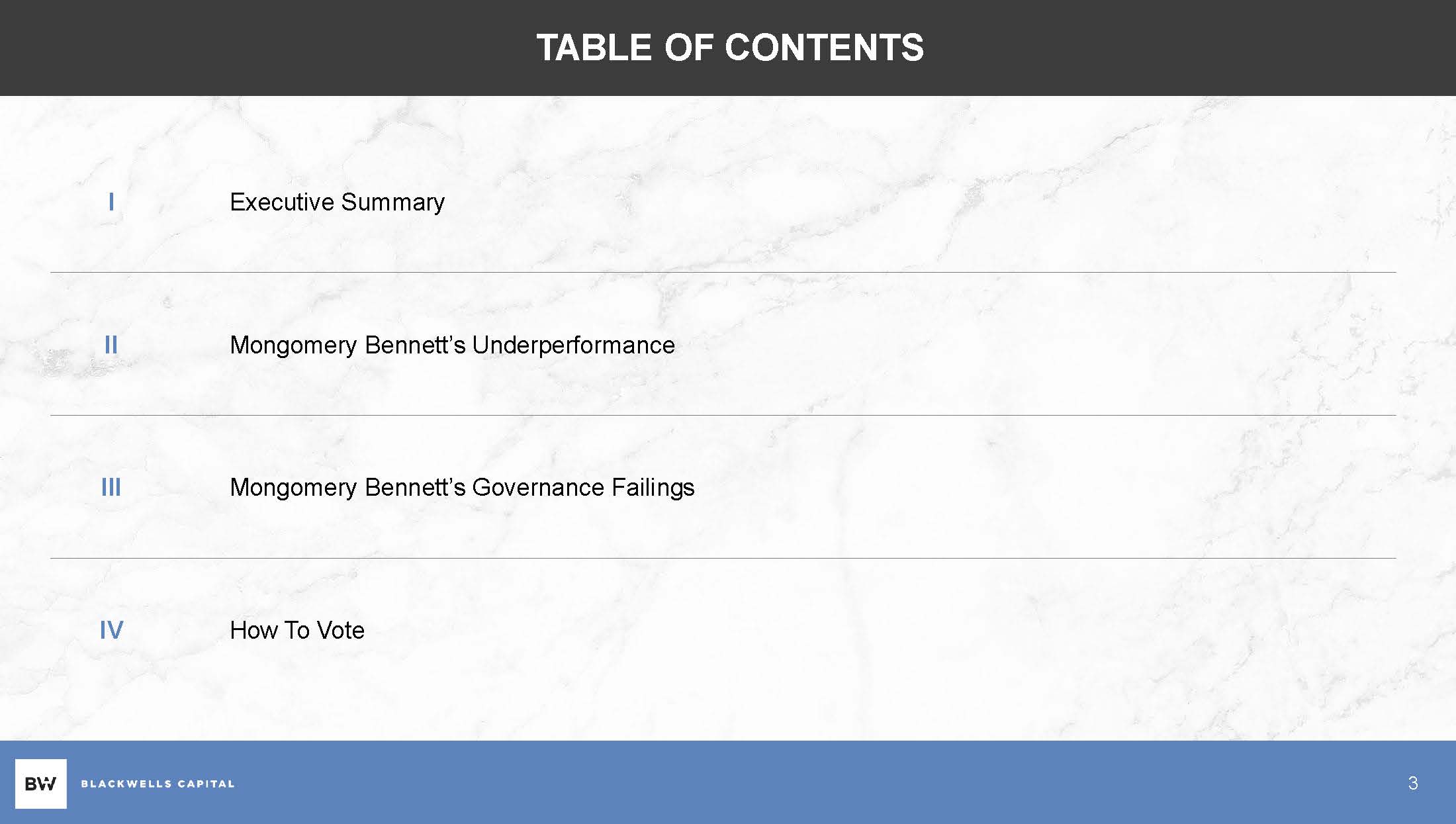 Executive Summary I Mongomery Bennett’s Underperformance II Mongomery Bennett’s Governance Failings III How To Vote IV 3 TABLE OF CONTENTS