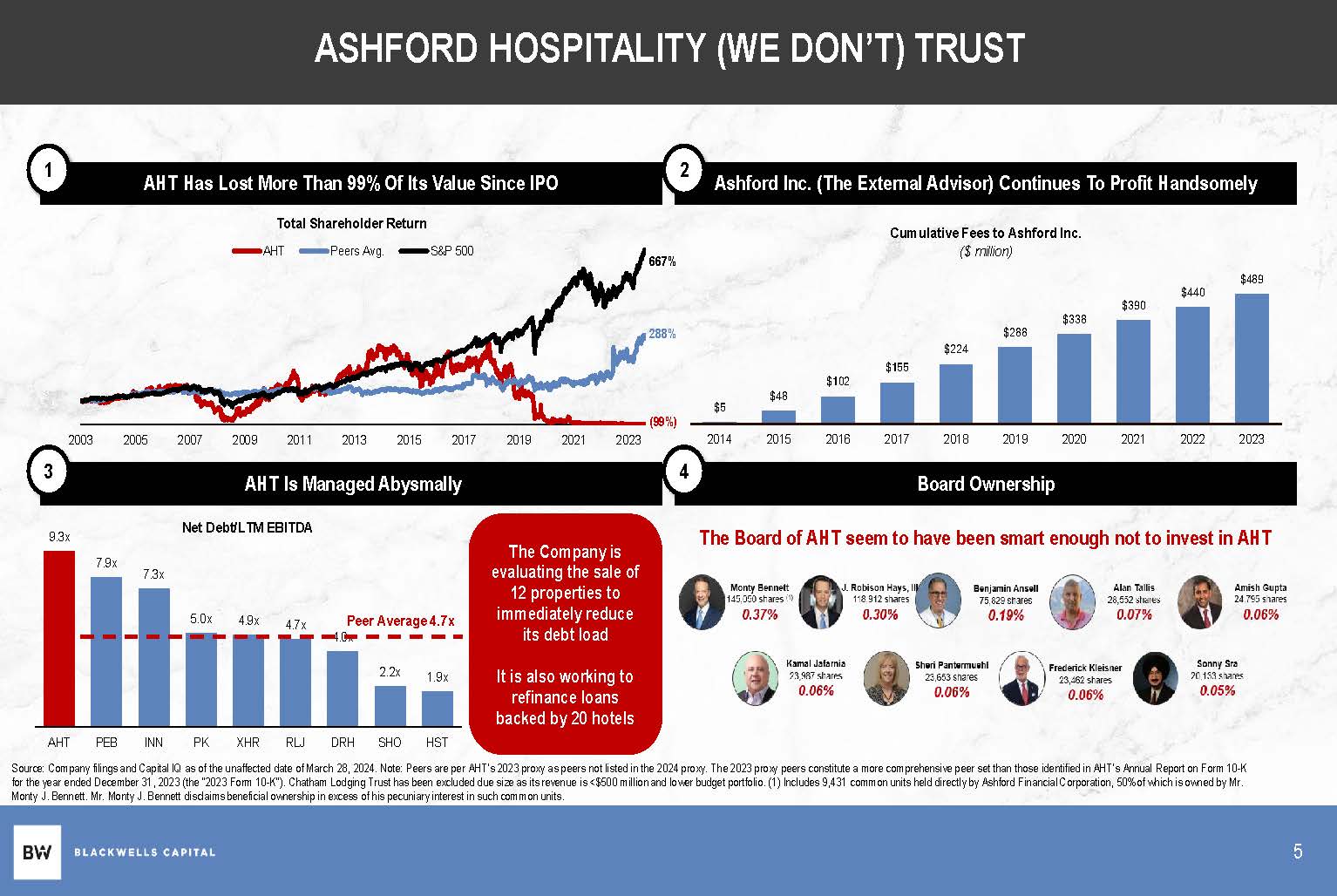 $288 $489 $440 $390 $338 2014 2015 2016 2017 2021 2022 2023 ASHFORD HOSPITALITY (WE DON’T) TRUST Ashford Inc. (The External Advisor) Continues To Profit Handsomely 1 AHT Has Lost More Than 99% Of Its Value…. 2 2018 2019 2020 Board Ownership 4 3 9.3x 7.9x 7.3x 5.0x 4.9x 4.7x 4.0x 2.2x 1.9x Peer Average 4.7x The Company is evaluating the sale of 12 properties to immediately reduce its debt load It is also working to refinance loans backed by 20 hotels Net Debt/LTM EBITDA Cumulative Fees to Ashford Inc. ($ million) The Board of AHT seem to have been smart enough not to invest in AHT AHT PEB INN PK XHR RLJ DRH SHO HST Source: Company filings and Capital IQ as of the unaffected date of March 28, 2024. Note: Peers are per AHT’s 2023 proxy as peers not listed in the 2024 proxy. The 2023 proxy peers constitute a more comprehensive peer set than those identified in AHT's Annual Report on Form 10 - K for the year ended December 31, 2023 (the "2023 Form 10 - K"). Chatham Lodging Trust has been excluded due size as its revenue is <$500 million and lower budget portfolio. (1) Includes 9,431 common units held directly by Ashford Financial Corporation, 50% of which is owned by Mr. Monty J. Bennett. Mr. Monty J. Bennett disclaims beneficial ownership in excess of his pecuniary interest in such common units. AHT Has Lost More Than 99% Of Its Value Since IPO 1 2003 2005 2007 2009 2011 2013 2015 2017 AHT Is Managed Abysmally 2019 2021 2023 S&P 500 Total Shareholder Return AHT Peers Avg. 667% 288% $224 $155 $102 $48 $5 (99%) 5
