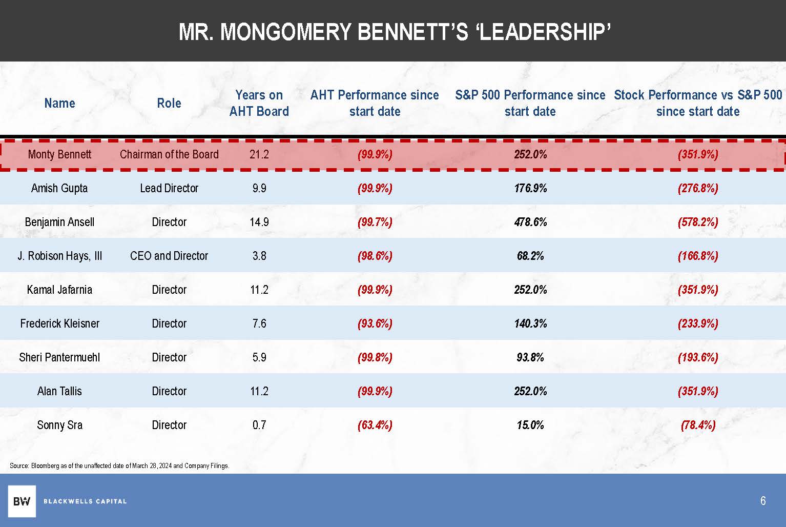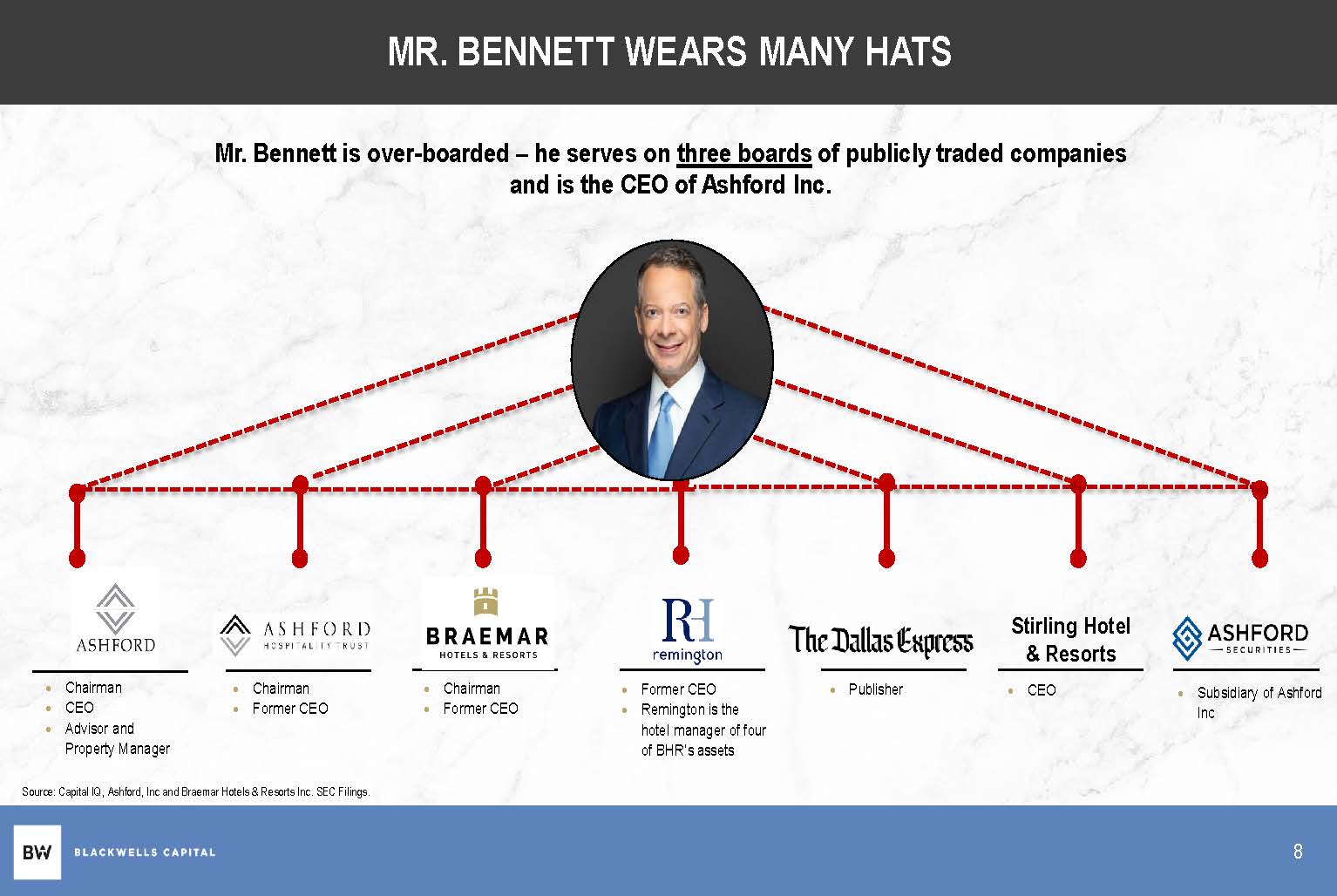 WHO IS MONTY BENNETT? Mr. Bennett took over his daddy's hotel business and here are the results: ▪ AHT – stock is down (99%) all time (1) ▪ BHR – stock is down (91%) all time (2) ▪ AINC – stock is down (95%) all time (3) Source: Capital IQ. Note data has been split adjusted by Capital IQ. (1) Calculated from IPO date, August 26, 2003 to unaffected date March 28, 2024. (2) Calculated from first trading date, November 20, 2013, to unaffected date March 28, 2024. November 7, 2014 to unaffected date March 28, 2024. 7