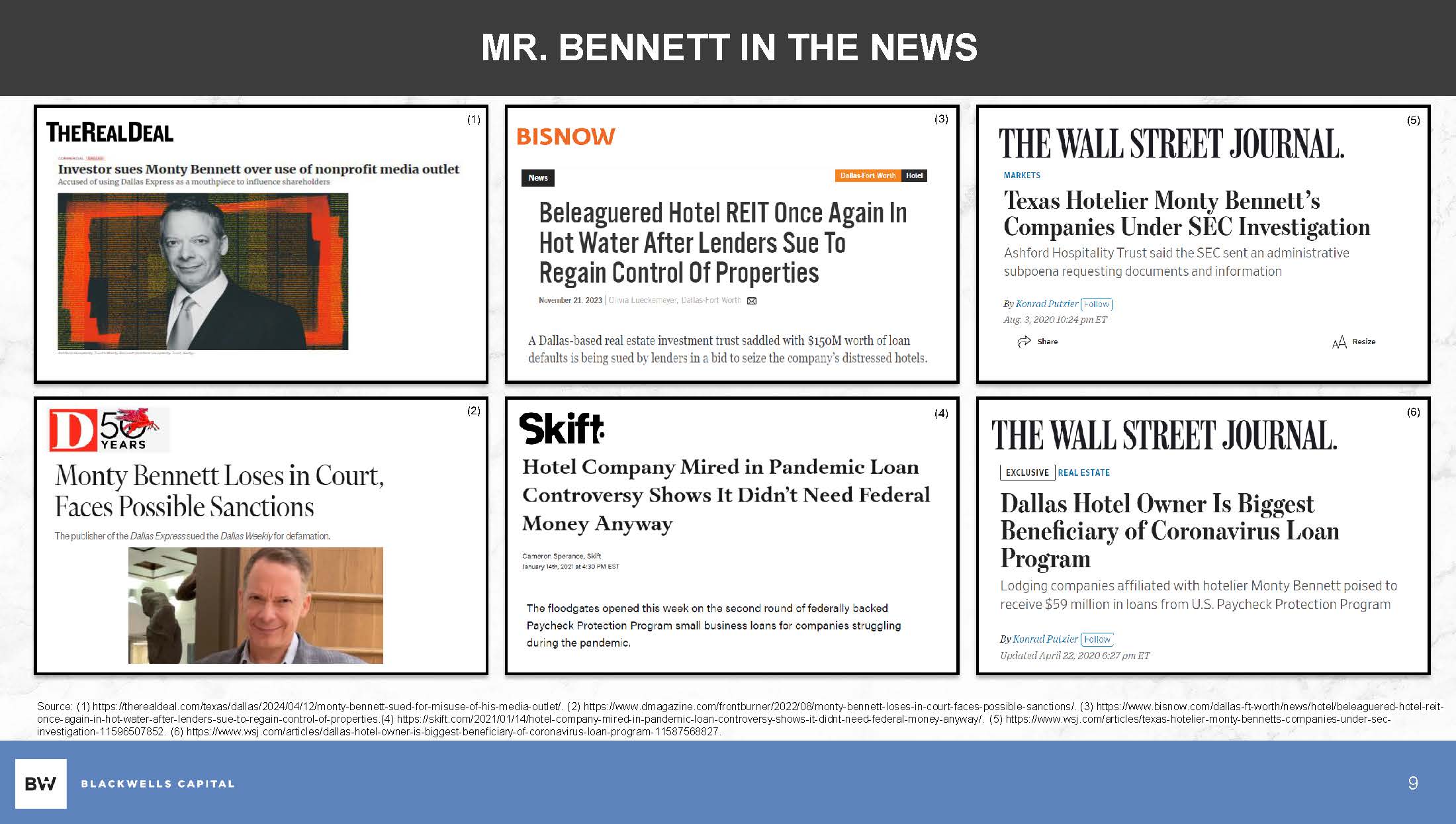 MR. BENNETT IN THE NEWS (1) (2) (3) (4) (5) (6) Source: (1) https://therealdeal.com/texas/dallas/2024/04/12/monty - bennett - sued - 9 for - misuse - of - his - media - outlet/. (2) https:/ /www.dmagazine.com/frontburner/2022/08/monty - bennett - loses in - - court - faces possible - - sanctions/. (3) https:/ /www.bisnow.com/dallas - ft - worth/news/hotel/beleaguered - hotel - reit - once - again - in - hot - water - after - lenders - sue - to - regain - control - of - properties.(4) https://skift.com/2021/01/14/hotel - company - mired - in - pandemic - loan - controversy - shows - it - didnt - need - federal - money - anyway/. (5) https:/ /www.wsj.com/articles/texas - hotelier - monty - bennetts - companies - under - sec - investigation - 11596507852. (6) https:// www.wsj.com/articles/dallas - hotel - owner - is - biggest - beneficiary - of - coronavirus - loan - program - 11587568827.