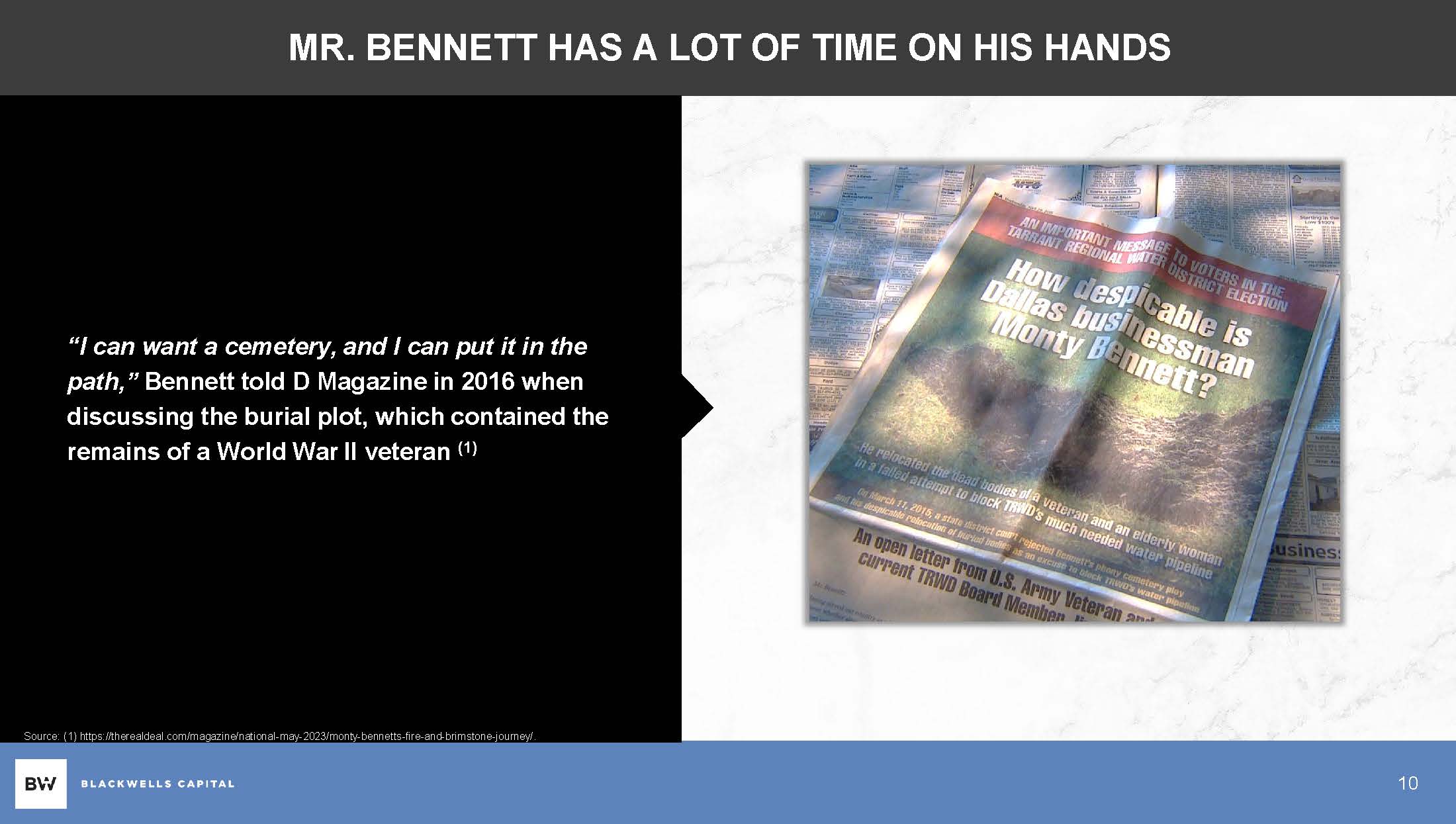 MR. BENNETT HAS A LOT OF TIME ON HIS HANDS “I can want a cemetery, and I can put it in the path,” Bennett told D Magazine in 2016 when discussing the burial plot, which contained the remains of a World War II veteran (1) Source: (1) https://therealdeal.com/magazine/national - may - 2023/monty - bennetts - fire - and - brimstone - journey/. 10