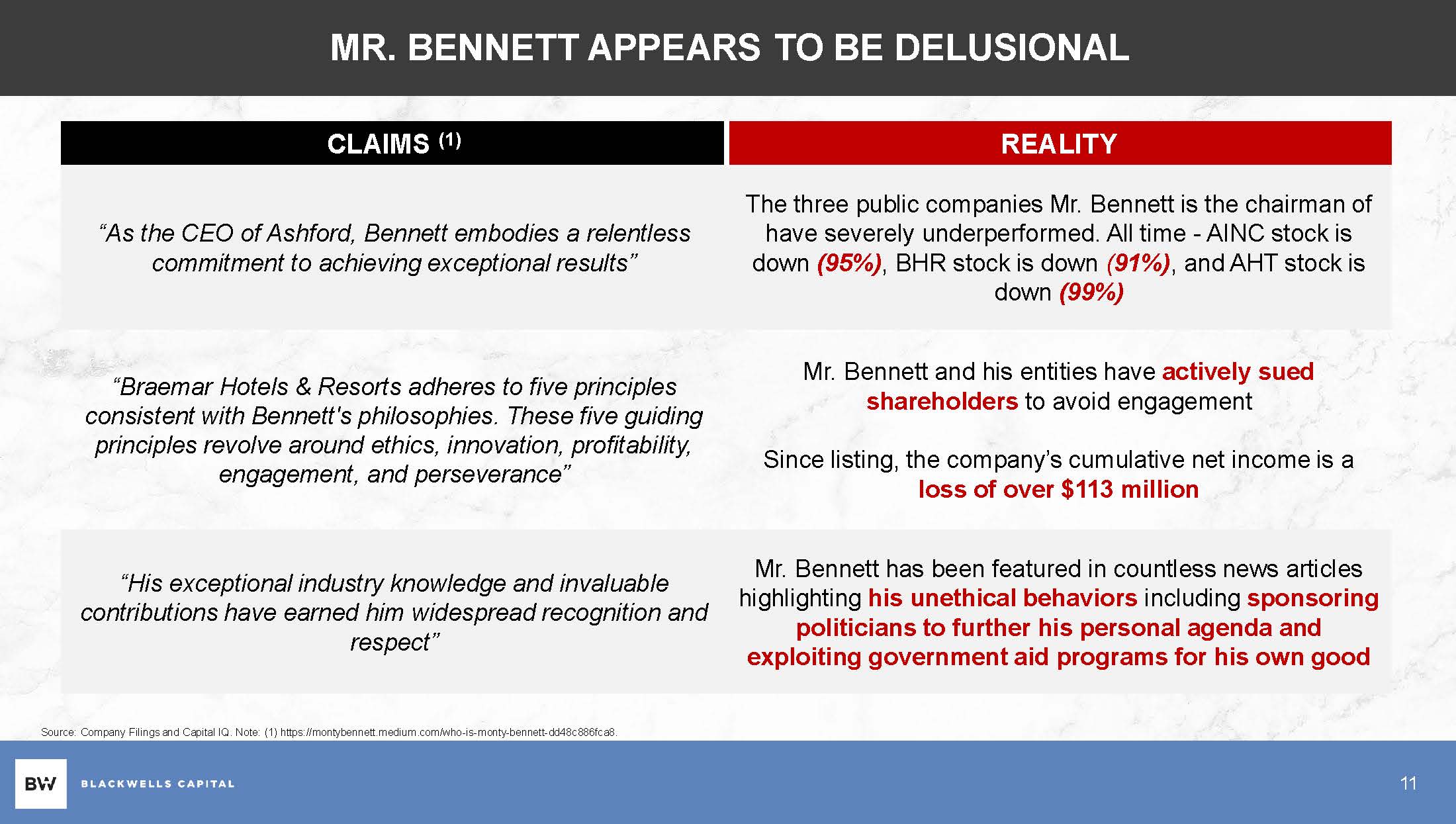 MR. BENNETT APPEARS TO BE DELUSIONAL 11 REALITY CLAIMS (1) The three public companies Mr. Bennett is the chairman of have severely underperformed. All time - AINC stock is down (95%) , BHR stock is down ( 91%) , and AHT stock is down (99%) “As the CEO of Ashford, Bennett embodies a relentless commitment to achieving exceptional results” Mr. Bennett and his entities have actively sued shareholders to avoid engagement Since listing, the company’s cumulative net income is a loss of over $113 million “Braemar Hotels & Resorts adheres to five principles consistent with Bennett's philosophies. These five guiding principles revolve around ethics, innovation, profitability, engagement, and perseverance” Mr. Bennett has been featured in countless news articles highlighting his unethical behaviors including sponsoring politicians to further his personal agenda and exploiting government aid programs for his own good “His exceptional industry knowledge and invaluable contributions have earned him widespread recognition and respect” Source: Company Filings and Capital IQ. Note: (1) https://montybennett.medium.com/who - is - monty - bennett - dd48c886fca8.