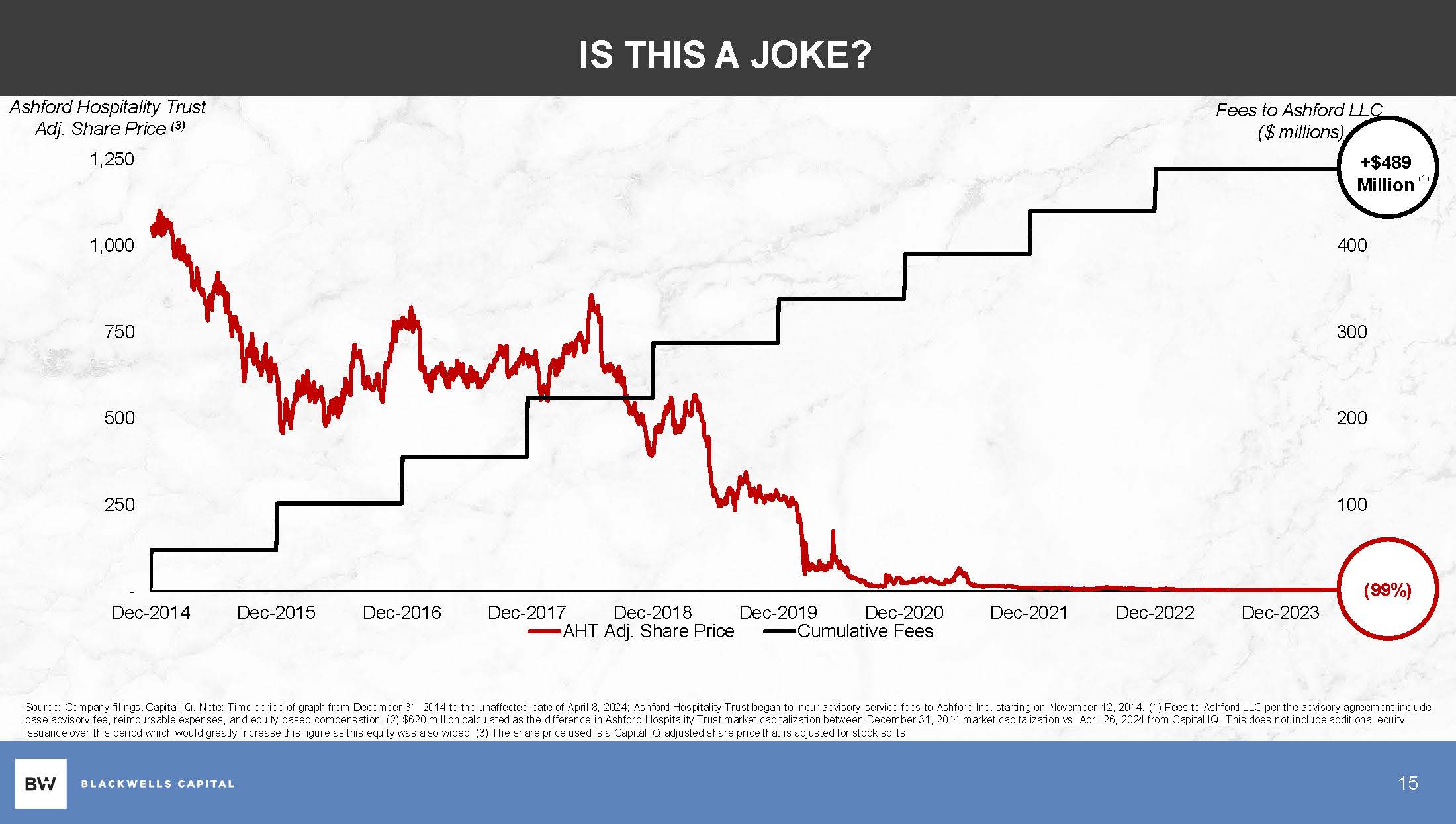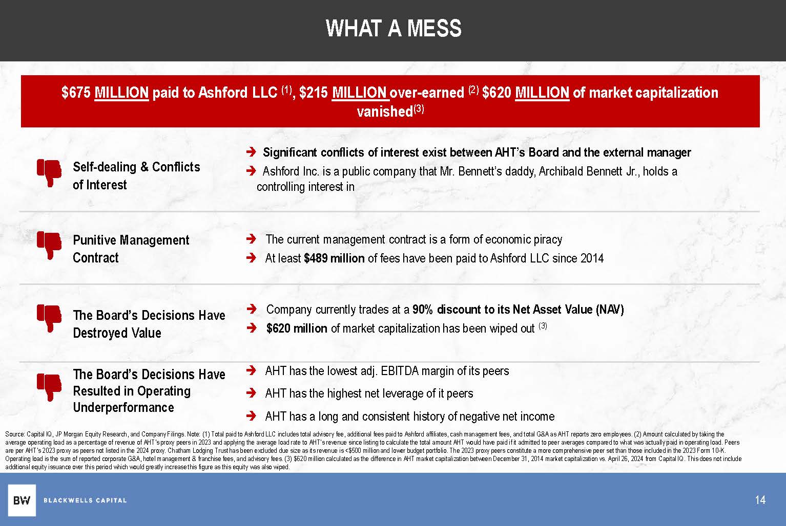 WHAT A MESS Significant conflicts of interest exist between AHT’s Board and the external manager Ashford Inc. is a public company that Mr. Bennett’s daddy, Archibald Bennett Jr., holds a controlling interest in Self - dealing & Conflicts of Interest The current management contract is a form of economic piracy At least $489 million of fees have been paid to Ashford LLC since 2014 Punitive Management Contract Company currently trades at a 90% discount to its Net Asset Value (NAV) $620 million of market capitalization has been wiped out (3) The Board’s Decisions Have Destroyed Value AHT has the lowest adj. EBITDA margin of its peers AHT has the highest net leverage of it peers The Board’s Decisions Have Resulted in Operating Underperformance $675 MILLION paid to Ashford LLC (1) , $215 MILLION over - earned (2) $620 MILLION of market capitalization vanished (3) 14 Source: Capital IQ, JP Morgan Equity Research, and Company Filings. Note: (1) Total paid to Ashford LLC includes total advisory fee, additional fees paid to Ashford affiliates, cash management fees, and total G&A as AHT reports zero employees. (2) Amount calculated by taking the average operating load as a percentage of revenue of AHT’s proxy peers in 2023 and applying the average load rate to AHT’s revenue since listing to calculate the total amount AHT would have paid if it admitted to peer averages compared to what was actually paid in operating load. Peers are per AHT’s 2023 proxy as peers not listed in the 2024 proxy. Chatham Lodging Trust has been excluded due size as its revenue is <$500 million and lower budget portfolio. The 2023 proxy peers constitute a more comprehensive peer set than those included in the 2023 Form 10 - K. Operating load is the sum of reported corporate G&A, hotel management & franchise fees, and advisory fees. (3) $620 million calculated as the difference in AHT market capitalization between December 31, 2014 market capitalization vs. April 26, 2024 from Capital IQ. This does not include additional equity issuance over this period which would greatly increase this figure as this equity was also wiped.