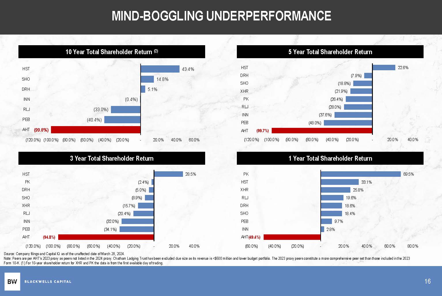MIND - BOGGLING UNDERPERFORMANCE 10 Year Total Shareholder Return (2) 5 Year Total Shareholder Return 3 Year Total Shareholder Return 1 Year Total Shareholder Return 2.8% 9.7% 19.6% 18.6% 18.4% 25.8% 33.1% 69.5% (40.0%) (20.0%) - 20.0% 40.0% 60.0% 80.0% PK HST XHR RLJ DRH SHO PEB INN AHT (49.4%) (60.0%) (94.8%) (32.0%) (34.1%) (20.4%) (15.7%) (2.4%) (5.0%) (8.9%) 28.5% (120.0%) (100.0%) (80.0%) (60.0%) (40.0%) (20.0%) - 20.0% 40.0% HST PK DRH SHO XHR RLJ INN PEB AHT (99.7%) (48.0%) (37.6%) (26.4%) (28.0%) (21.9%) (18.8%) (7.9%) 22.6% (120.0%) (100.0%) (80.0%) (60.0%) (40.0%) (20.0%) - 20.0% 40.0% HST DRH SHO XHR PK RLJ INN PEB AHT (40.4%) 16 (33.0%) (0.4%) 5.1% 14.8% 43.4% (120.0%) (100.0%) (80.0%) (60.0%) (40.0%) (20.0%) - 20.0% 40.0% 60.0% AHT (99.8%) PEB RLJ INN DRH SHO HST Source: Company filings and Capital IQ as of the unaffected date of March 28, 2024. Note: Peers are per AHT’s 2023 proxy as peers not listed in the 2024 proxy. Chatham Lodging Trust has been excluded due size as its revenue is <$500 million and lower budget portfolio. The 2023 proxy peers constitute a more comprehensive peer set than those included in the 2023 Form 10 - K. (1) For 10 - year shareholder return for XHR and PK the data is from the first available day of trading.