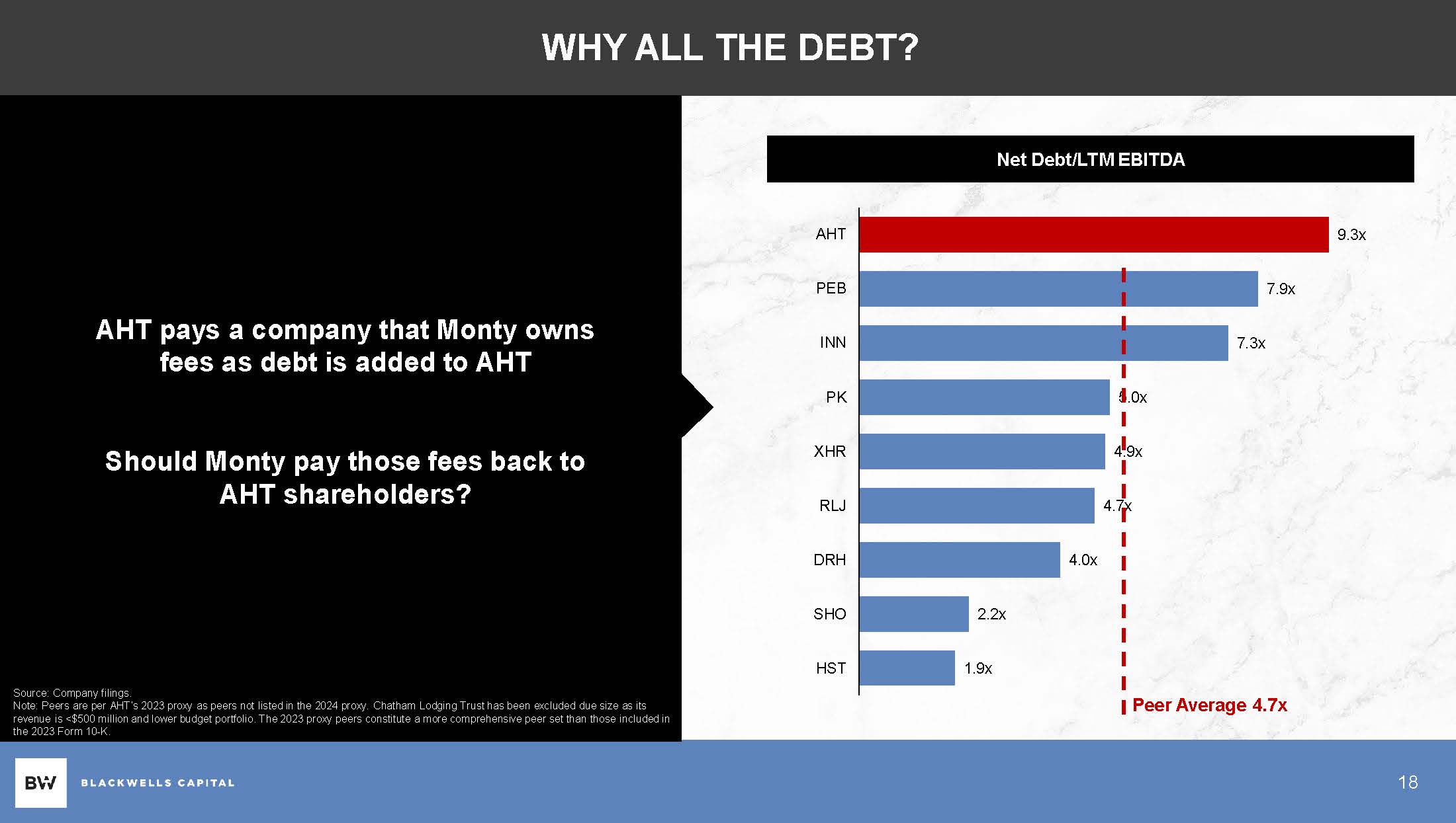 Ashford Hospitality Trust’s operating load is >40x the peer average AHT’S OPERATING LOAD IS RIDICULOUS Operating Load (1) as % of Market Cap by Hotel REIT Peers (2) Peer Average 5.0% 2.1% 17 2.6% 4.4% 4.6% 4.6% 5.1% 7.2% 9.1% 212.8% SHO HST PEB DRH XHR PK INN RLJ AHT Source: Capital IQ and JP Morgan Equity Research. Financials as of December 31, 2023 and market date as of the unaffected date March 28, 2024. Note: (1) Operating load is the sum of reported corporate G&A, hotel management & franchise fees and advisory fees. (2) Peers are per AHT’s 2023 proxy as peers not listed in the 2024 proxy. Chatham Lodging Trust has been excluded due size as its revenue is <$500 million and lower budget portfolio. The 2023 proxy peers constitute a more comprehensive peer set than those included in the 2023 Form 10 - K.