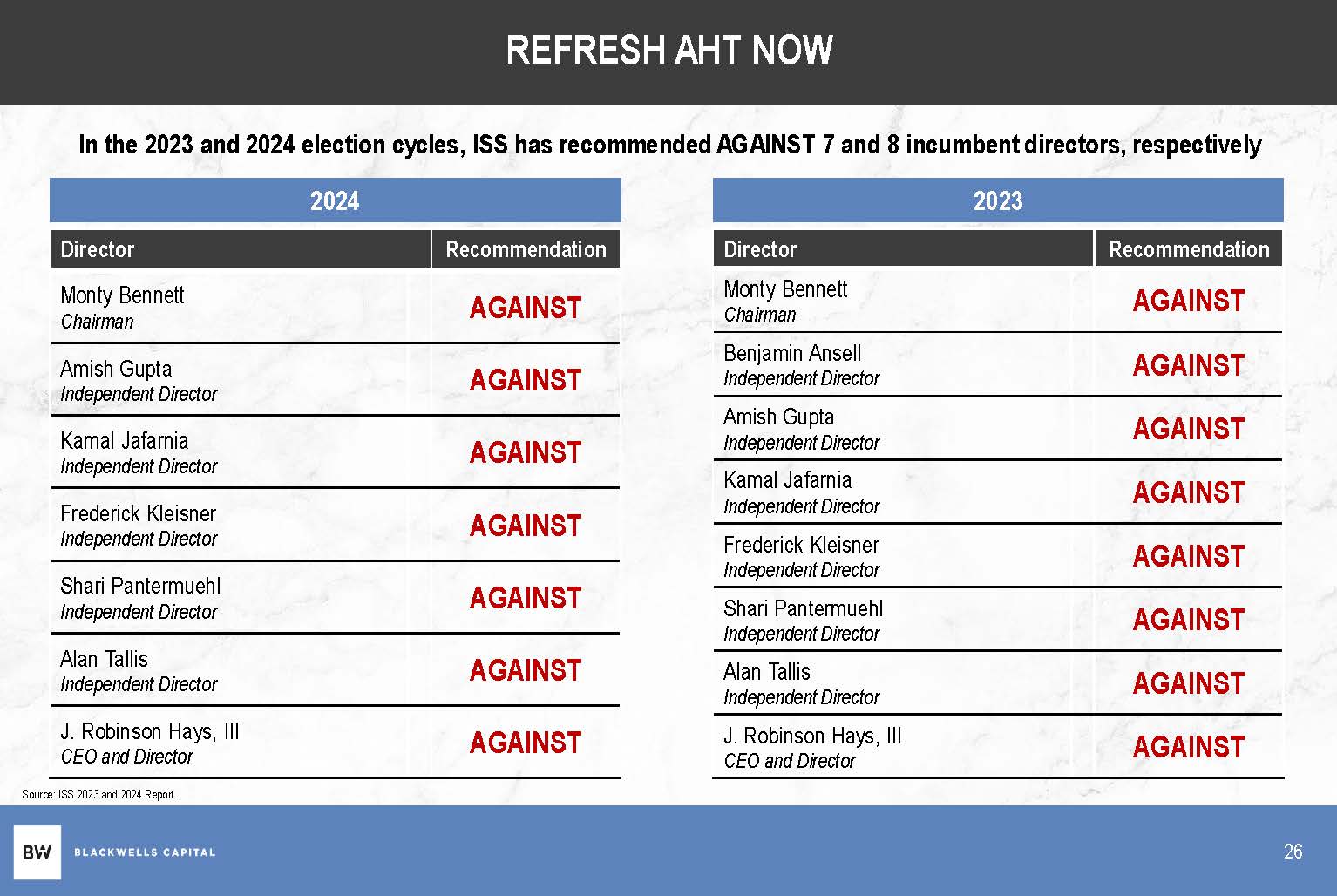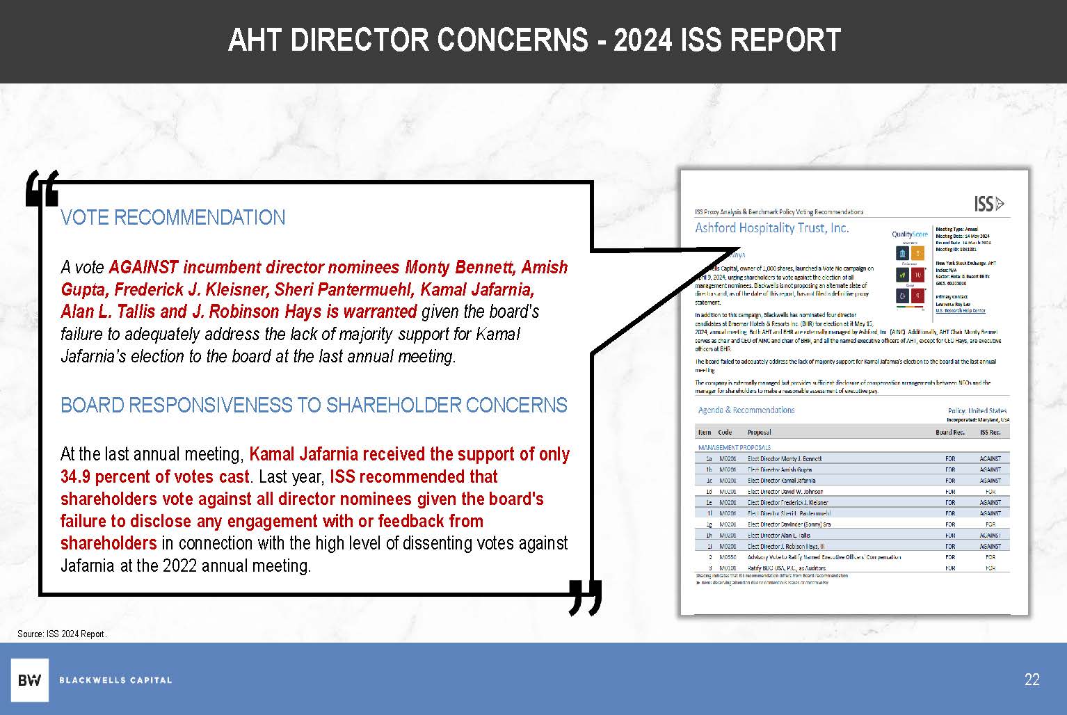AHT DIRECTOR CONCERNS - 2024 ISS REPORT Source: ISS 2024 Report. VOTE RECOMMENDATION A vote AGAINST incumbent director nominees Monty Bennett, Amish Gupta, Frederick J. Kleisner, Sheri Pantermuehl, Kamal Jafarnia, Alan L. Tallis and J. Robinson Hays is warranted given the board's failure to adequately address the lack of majority support for Kamal Jafarnia's election to the board at the last annual meeting. BOARD RESPONSIVENESS TO SHAREHOLDER CONCERNS At the last annual meeting, Kamal Jafarnia received the support of only 34.9 percent of votes cast . Last year, ISS recommended that shareholders vote against all director nominees given the board's failure to disclose any engagement with or feedback from shareholders in connection with the high level of dissenting votes against Jafarnia at the 2022 annual meeting. 22