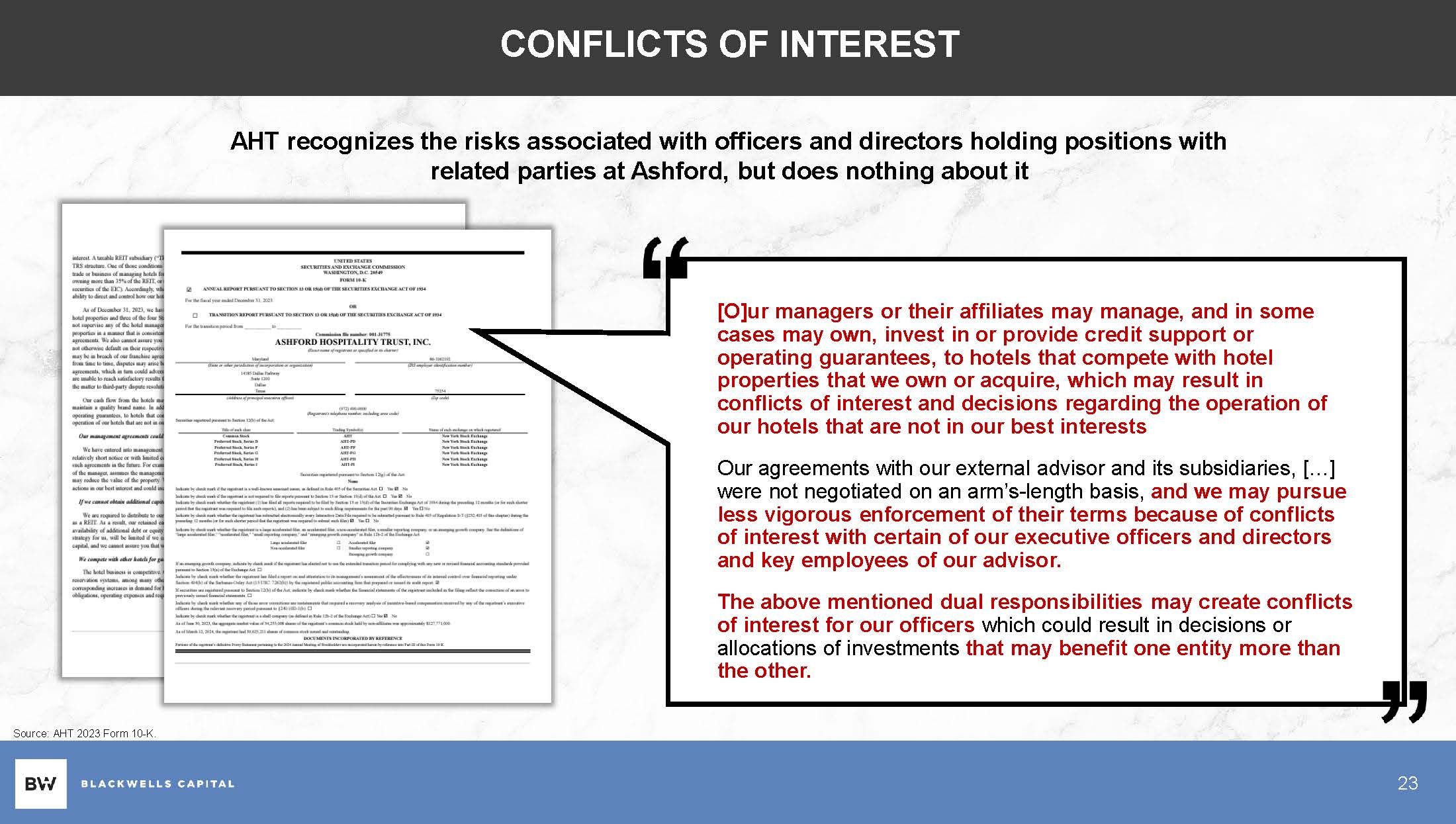 CONFLICTS OF INTEREST [O]ur managers or their affiliates may manage, and in some cases may own, invest in or provide credit support or operating guarantees, to hotels that compete with hotel properties that we own or acquire, which may result in conflicts of interest and decisions regarding the operation of our hotels that are not in our best interests Our agreements with our external advisor and its subsidiaries, […] were not negotiated on an arm’s - length basis, and we may pursue less vigorous enforcement of their terms because of conflicts of interest with certain of our executive officers and directors and key employees of our advisor. The above mentioned dual responsibilities may create conflicts of interest for our officers which could result in decisions or allocations of investments that may benefit one entity more than the other. AHT recognizes the risks associated with officers and directors holding positions with related parties at Ashford, but does nothing about it Source: AHT 2023 Form 10 - K. 23
