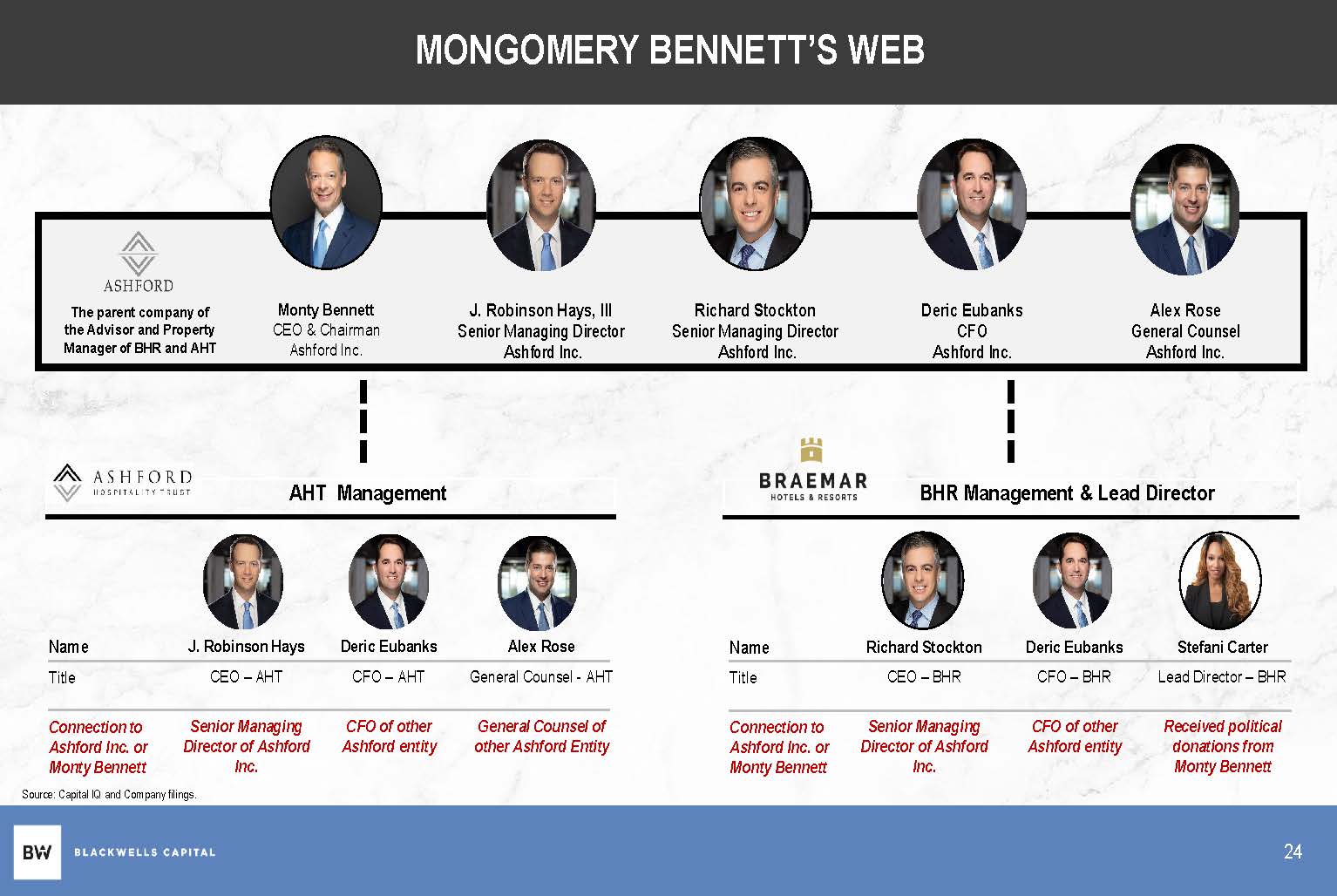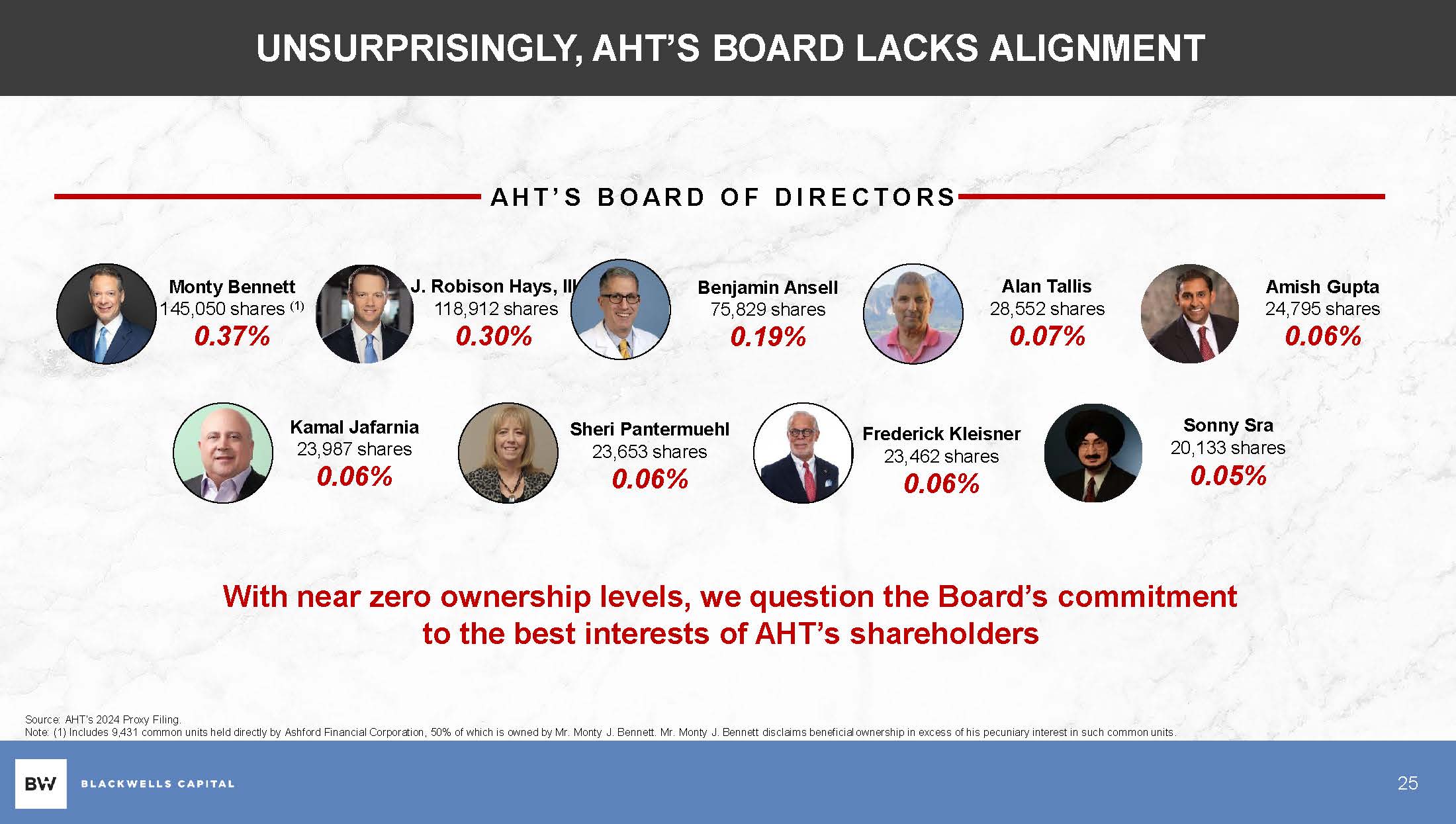 “It is clear to us that Ashford stockholders have suffered from a disasterous stock price performance, abysmal corporate governance and what appears to be a self-dealing external advisory agreement that makes Montgomery Bennett rich at the expense of stockholders. The Board must be held to account for its failure to act as independent fiduciaries. In our opinion, the Board, at best, lacks the necessary skills and acumen and, at worst, could face personal liability for rubber-stamping Mr. Bennett’s unchecked parade on Ashford’s coffers. Stockholders have an opportunity to send a clear and resounding message to the Board by voting “AGAINST” the election of the incumbent directors at the 2024 Annual Meeting.”