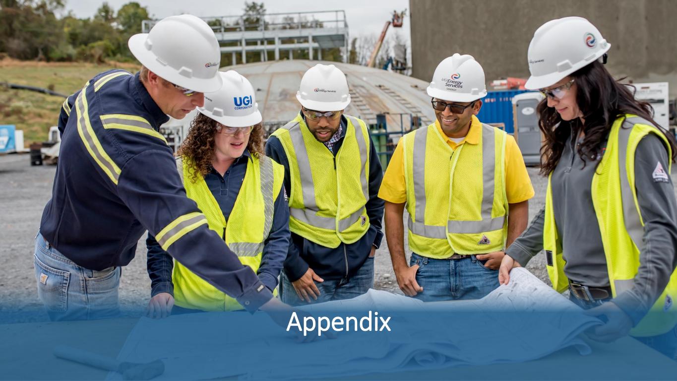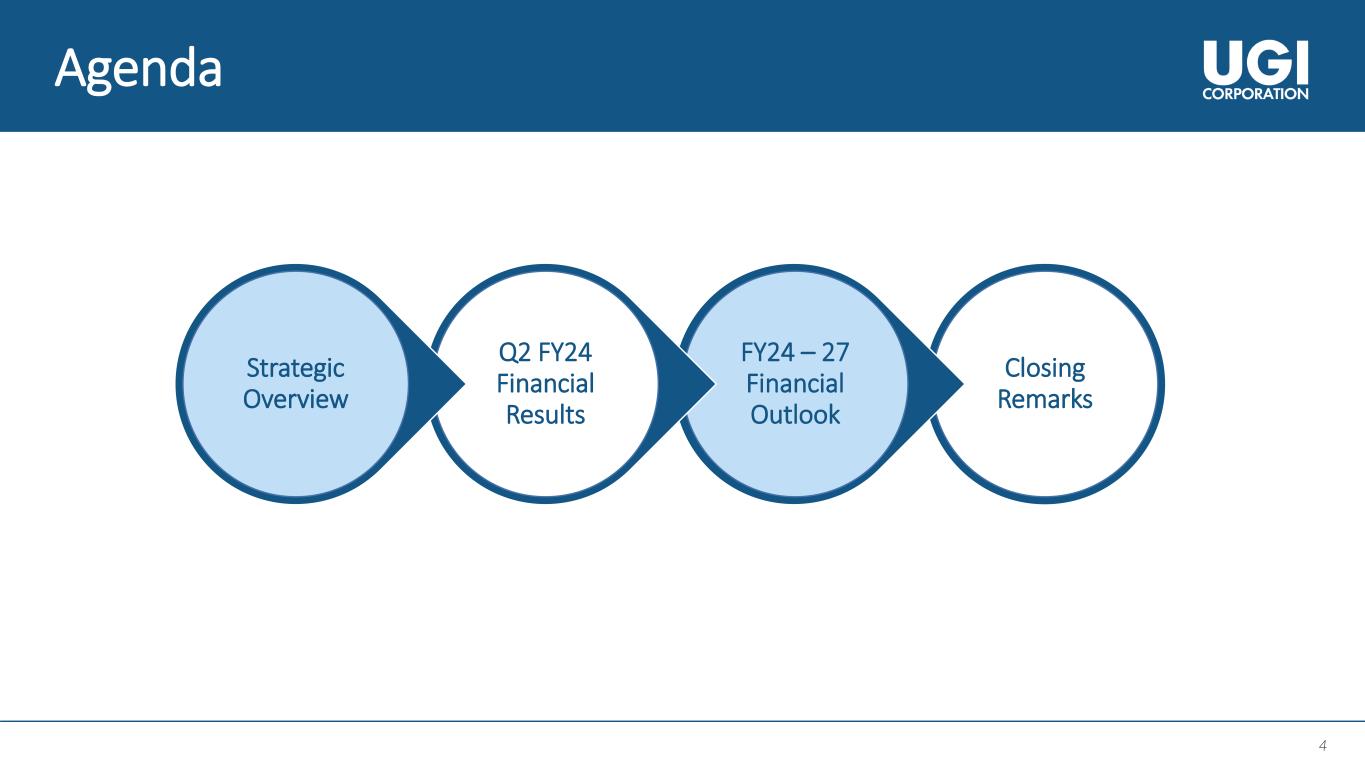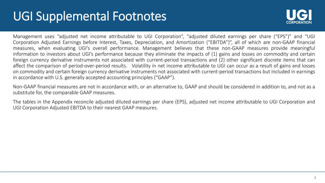2 2 About This Presentation This presentation contains statements, estimates and projections that are forward-looking statements (as defined in Section 21E of the Securities Exchange Act of 1934, as amended, and Section 27A of the Securities Act of 1933, as amended). Such statements use forward-looking words such as “believe,” “plan,” “anticipate,” “continue,” “estimate,” “expect,” “may,” or other similar words and terms of similar meaning, although not all forward-looking statements contain such words. These statements discuss plans, strategies, events or developments that we expect or anticipate will or may occur in the future. Management believes that these are reasonable as of today’s date only. Actual results may differ significantly because of risks and uncertainties that are difficult to predict and many of which are beyond management’s control; accordingly, there is no assurance that results will be realized. You should read UGI’s Annual Report on Form 10-K for a more extensive list of factors that could affect results. We undertake no obligation (and expressly disclaim any obligation) to update publicly any forward-looking statement, whether as a result of new information or future events, except as required by the federal securities laws. Among them are adverse weather conditions (including increasingly uncertain weather patterns due to climate change) resulting in reduced demand, the seasonal nature of our business, and disruptions in our operations and supply chain; cost volatility and availability of energy products, including propane and other LPG, natural gas, and electricity, as well as the availability of LPG cylinders, and the capacity to transport product to our customers; changes in domestic and foreign laws and regulations, including safety, health, tax, transportation, consumer protection, data privacy, accounting, and environmental matters, such as regulatory responses to climate change; the inability to timely recover costs through utility rate proceedings; increased customer conservation measures due to high energy prices and improvements in energy efficiency and technology resulting in reduced demand; adverse labor relations and our ability to address existing or potential workforce shortages; the impact of pending and future legal or regulatory proceedings, inquiries or investigations; competitive pressures from the same and alternative energy sources; failure to acquire new customers or retain current customers, thereby reducing or limiting any increase in revenues; liability for environmental claims; customer, counterparty, supplier, or vendor defaults; liability for uninsured claims and for claims in excess of insurance coverage, including those for personal injury and property damage arising from explosions, acts of war, terrorism, natural disasters, pandemics and other catastrophic events that may result from operating hazards and risks incidental to generating and distributing electricity and transporting, storing and distributing natural gas and LPG in all forms; transmission or distribution system service interruptions; political, regulatory and economic conditions in the United States, Europe and other foreign countries, including uncertainties related to the war between Russia and Ukraine, the conflict in the Middle East, the European energy crisis, and foreign currency exchange rate fluctuations (particularly the euro); credit and capital market conditions, including reduced access to capital markets and interest rate fluctuations; changes in commodity market prices resulting in significantly higher cash collateral requirements; impacts of our indebtedness and the restrictive covenants in our debt agreements; reduced distributions from subsidiaries impacting the ability to pay dividends or service debt; changes in Marcellus and Utica Shale gas production; the success of our strategic initiatives and investments intended to advance our business strategy; our ability to successfully integrate acquired businesses and achieve anticipated synergies; the interruption, disruption, failure, malfunction, or breach of our information technology systems, and those of our third-party vendors or service providers, including due to cyber-attack; the inability to complete pending or future energy infrastructure projects; our ability to attract, develop, retain and engage key employees; uncertainties related to global pandemics; the impact of a material impairment of our assets; the impact of proposed or future tax legislation; the impact of declines in the stock market or bond market, and a low interest rate environment, on our pension liability; our ability to protect our intellectual property; our ability to overcome supply chain issues that may result in delays or shortages in, as well as increased costs of, equipment, materials or other resources that are critical to our business operations; and our ability to control operating costs and realize cost savings.