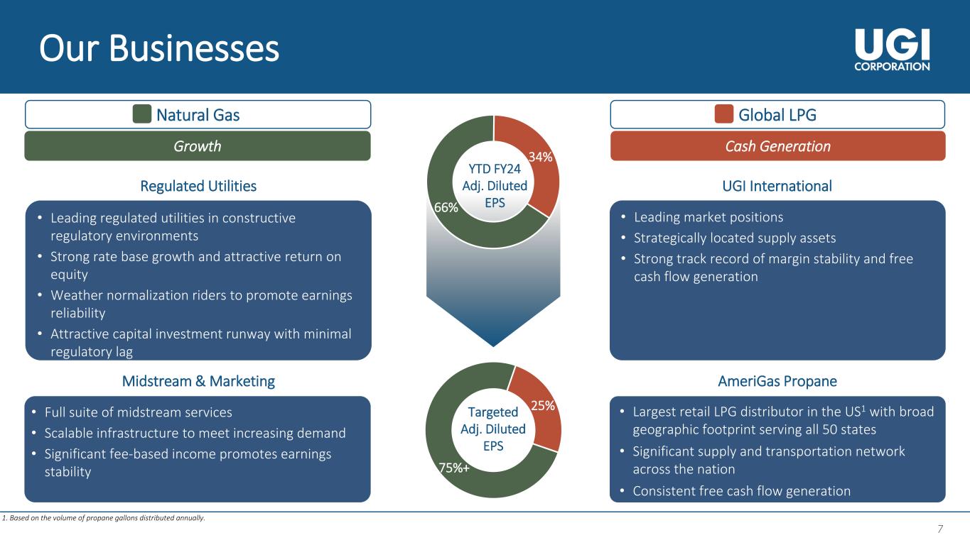 6 6 Strategic Review Update 6 ➢ AmeriGas Propane ➢ Portfolio optimization opportunities ➢ Opportunities to optimize our cost structure ➢ Financing solutions and levers to strengthen the balance sheet and create greater financial flexibility Strategic Review Conclusion ➢ Completed the strategic review that was primarily focused on AmeriGas Propane o Conducted a thorough process, evaluating a broad range of strategic alternatives, alongside our financial advisors o Board’s conclusion: In the current market, the optimal decision is to retain AmeriGas and focus on a restructuring and operational improvement plan for that business ➢ Repositioning UGI to create sustainable value for shareholders o Resilient core business with a clear and compelling strategy o Focused on strengthening the balance sheet o Pursuing operational efficiencies and sustainable cost savings o Committed to portfolio optimization and growth Scope of the Review