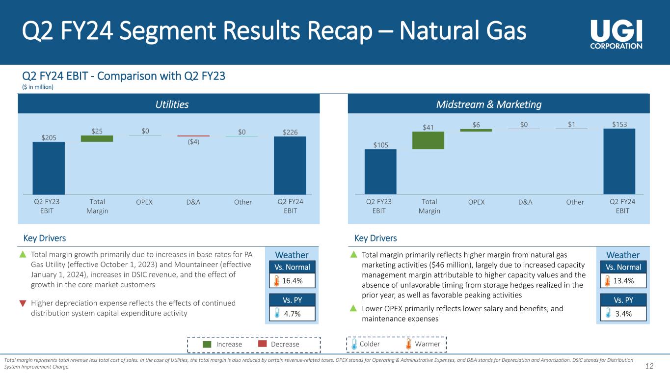 11 11 Q2 FY24 Results Recap Q2 FY24 Adjusted Diluted EPS1 – Comparison with Q2 FY23 Key Drivers Natural Gas businesses • Higher capacity management and peaking margins • Higher gas and electric base rates • Lower operating expenses Corporate & Other • Lower income taxes Global LPG businesses • Warmer than prior year weather • Higher total margin in the LPG business at UGI International • Higher income taxes for AmeriGas ($0.16) • Lower operating expenses • Lower non-core energy marketing margins $1.68 $1.97 Q2 FY24 GAAP Diluted EPS of $2.30 compared to $0.51 in Q2 FY23 1. Adjusted diluted EPS is a non-GAAP measure. See Appendix for reconciliation. 11
