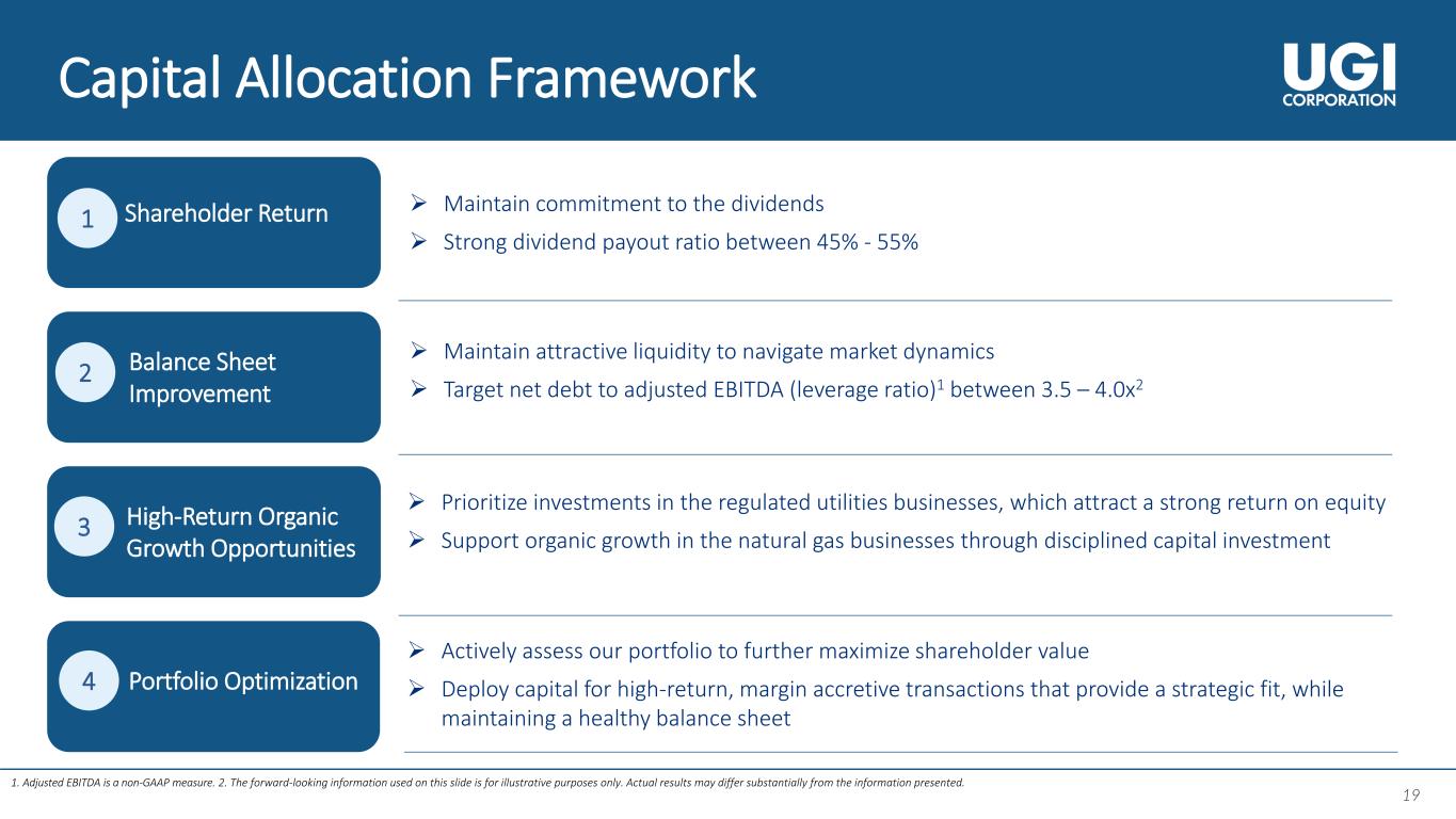 17 17 FY24 - 27 Financial Targets 17 1. The forward-looking information used on this slide is for illustrative purposes only. Actual numbers may differ substantially from the figures presented. 2. Because we are unable to predict certain potentially material items affecting diluted earnings per share on a GAAP basis, principally mark-to-market gains and losses on commodity and certain foreign currency derivative instruments, we cannot reconcile fiscal year 2024 adjusted diluted EPS, a non-GAAP measure, to diluted earnings per share, the most directly comparable GAAP measure, in reliance on the “unreasonable efforts” exception set forth in SEC rules. 3. Defined as net debt to Adjusted EBITDA. Adjusted EBITDA is a non-GAAP measure. Executing on our strategy to deliver sustainable shareholder value UGI Corporation reaffirms its FY24 adjusted diluted EPS guidance range of $2.70 - $3.002 4 – 6% $3.7 - $4.1B 9%+ 3.5 – 4.0x EPS Growth Rate Capital Expenditure Rate Base Growth Rate Leverage Ratio3 1