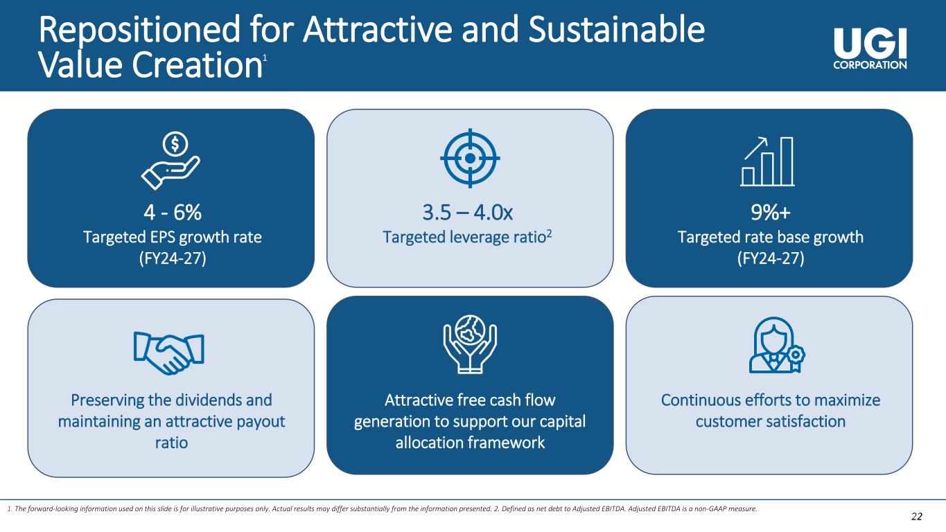 21 21 FY24-27 Capital Deployment Plan 21 1 66% 18% 9% 7% Utilities Midstream & Marketing UGI International AmeriGas Propane Uses of Cash Growth and Maintenance Capital by Segment ~$3.9B ➢ Capital plan funded by cash flow from operations ➢ Disciplined investments to achieve an optimal portfolio mix ~$0.2B ~$0.6B ~$3.3B ~$1.3B ➢ ~85% of total capital invested in natural gas businesses ➢ 75%+ of growth capital being deployed in the regulated utilities businesses 1. The forward-looking information used on this slide is for illustrative purposes only. Actual numbers may differ substantially from the figures presented.