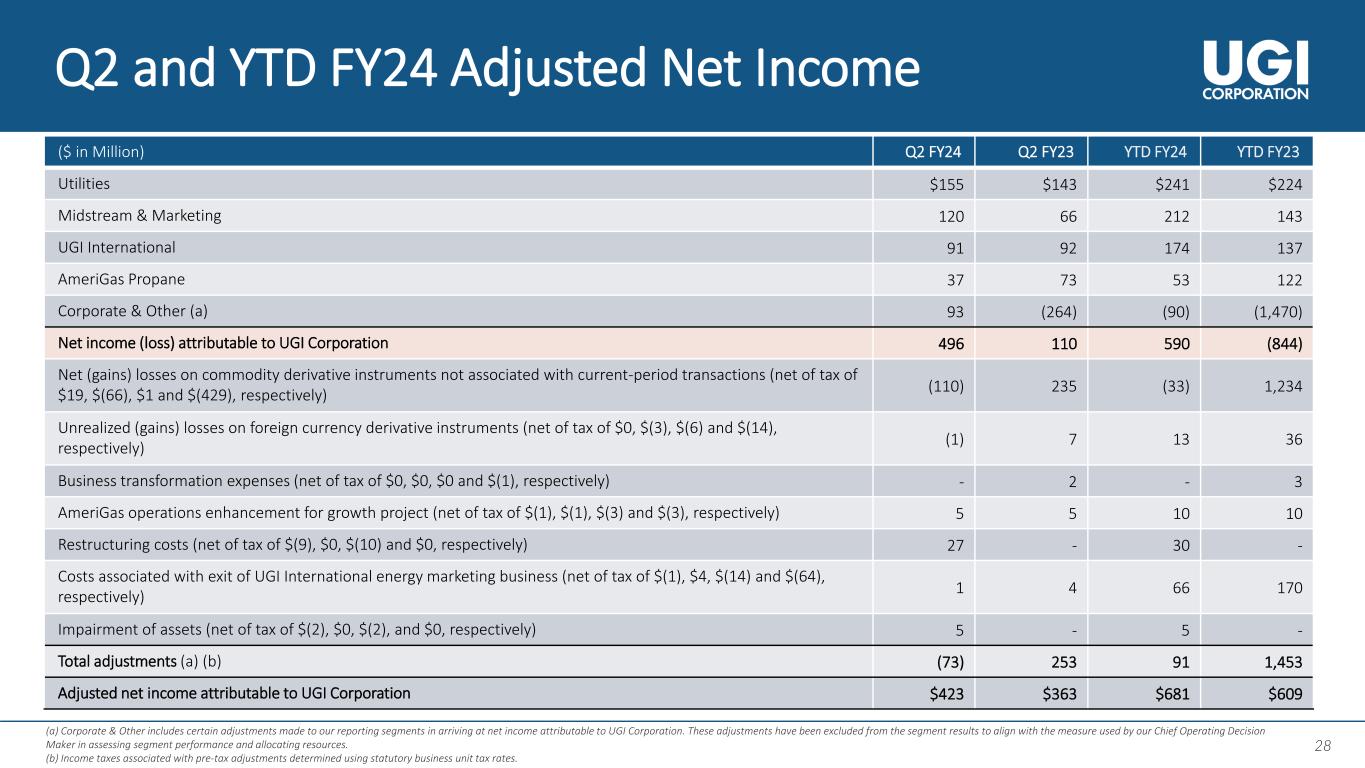 27 27 Q2 and YTD FY24 Adjusted Diluted Earnings per Share (a) Corporate & Other includes certain adjustments made to our reporting segments in arriving at net income attributable to UGI Corporation. These adjustments have been excluded from the segment results to align with the measure used by our Chief Operating Decision Maker in assessing segment performance and allocating resources. (b) The loss per share for the six months ended March 31, 2023, was determined excluding the effect of 6.35 million dilutive shares as the impact of such shares would have been antidilutive due to the net loss for the period. Adjusted earnings per share for the six months ended March 31, 2023, was determined based upon fully diluted shares of 216.25 million.. Q2 FY24 Q2 FY23 YTD FY24 YTD FY23 Utilities $0.72 $0.66 $1.12 $1.04 Midstream & Marketing 0.56 0.31 0.98 0.66 UGI International 0.42 0.43 0.81 0.64 AmeriGas Propane 0.17 0.34 0.25 0.56 Corporate & Other (a) 0.43 (1.23) (0.42) (6.92) Diluted earnings (loss) per share (b) 2.30 0.51 2.74 (4.02) Net (gains) losses on commodity derivative instruments not associated with current-period transactions (b) (0.50) 1.09 (0.16) 5.80 Unrealized losses on foreign currency derivative instruments - 0.03 0.06 0.17 Business transformation expenses - 0.01 - 0.01 AmeriGas operations enhancement for growth project 0.02 0.02 0.05 0.05 Restructuring costs 0.13 - 0.14 - Costs associated with exit of UGI International energy marketing business - 0.02 0.31 0.81 Impairment of assets 0.02 - 0.02 - Total adjustments (a) (0.33) 1.17 0.42 6.84 Adjusted diluted earnings per share (b) $1.97 $1.68 $3.16 $2.82