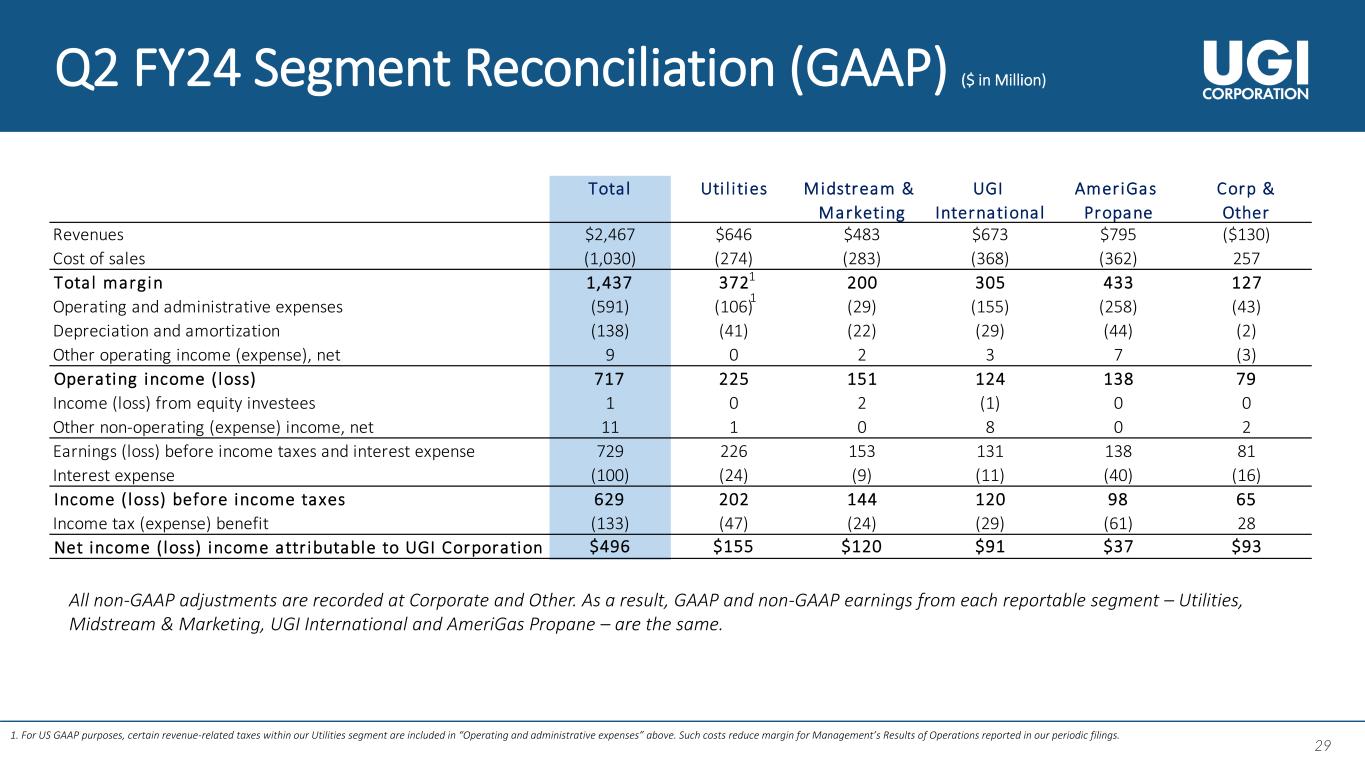 28 28 Q2 and YTD FY24 Adjusted Net Income ($ in Million) Q2 FY24 Q2 FY23 YTD FY24 YTD FY23 Utilities $155 $143 $241 $224 Midstream & Marketing 120 66 212 143 UGI International 91 92 174 137 AmeriGas Propane 37 73 53 122 Corporate & Other (a) 93 (264) (90) (1,470) Net income (loss) attributable to UGI Corporation 496 110 590 (844) Net (gains) losses on commodity derivative instruments not associated with current-period transactions (net of tax of $19, $(66), $1 and $(429), respectively) (110) 235 (33) 1,234 Unrealized (gains) losses on foreign currency derivative instruments (net of tax of $0, $(3), $(6) and $(14), respectively) (1) 7 13 36 Business transformation expenses (net of tax of $0, $0, $0 and $(1), respectively) - 2 - 3 AmeriGas operations enhancement for growth project (net of tax of $(1), $(1), $(3) and $(3), respectively) 5 5 10 10 Restructuring costs (net of tax of $(9), $0, $(10) and $0, respectively) 27 - 30 - Costs associated with exit of UGI International energy marketing business (net of tax of $(1), $4, $(14) and $(64), respectively) 1 4 66 170 Impairment of assets (net of tax of $(2), $0, $(2), and $0, respectively) 5 - 5 - Total adjustments (a) (b) (73) 253 91 1,453 Adjusted net income attributable to UGI Corporation $423 $363 $681 $609 (a) Corporate & Other includes certain adjustments made to our reporting segments in arriving at net income attributable to UGI Corporation. These adjustments have been excluded from the segment results to align with the measure used by our Chief Operating Decision Maker in assessing segment performance and allocating resources. (b) Income taxes associated with pre-tax adjustments determined using statutory business unit tax rates.