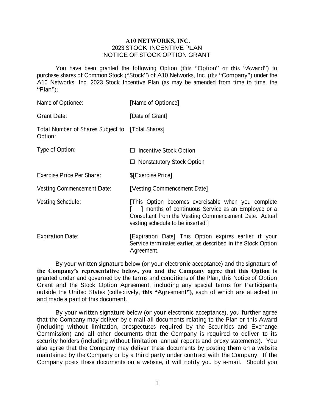 1 A10 NETWORKS, INC. 2023 STOCK INCENTIVE PLAN NOTICE OF STOCK OPTION GRANT You have been granted the following Option (this “Option” or this “Award”) to purchase shares of Common Stock (“Stock”) of A10 Networks, Inc. (the “Company”) under the A10 Networks, Inc. 2023 Stock Incentive Plan (as may be amended from time to time, the “Plan”): Name of Optionee: [Name of Optionee] Grant Date: [Date of Grant] Total Number of Shares Subject to Option: [Total Shares] Type of Option: ☐ Incentive Stock Option ☐ Nonstatutory Stock Option Exercise Price Per Share: $[Exercise Price] Vesting Commencement Date: [Vesting Commencement Date] Vesting Schedule: [This Option becomes exercisable when you complete [___] months of continuous Service as an Employee or a Consultant from the Vesting Commencement Date. Actual vesting schedule to be inserted.] Expiration Date: [Expiration Date] This Option expires earlier if your Service terminates earlier, as described in the Stock Option Agreement. By your written signature below (or your electronic acceptance) and the signature of the Company’s representative below, you and the Company agree that this Option is granted under and governed by the terms and conditions of the Plan, this Notice of Option Grant and the Stock Option Agreement, including any special terms for Participants outside the United States (collectively, this “Agreement”), each of which are attached to and made a part of this document. By your written signature below (or your electronic acceptance), you further agree that the Company may deliver by e-mail all documents relating to the Plan or this Award (including without limitation, prospectuses required by the Securities and Exchange Commission) and all other documents that the Company is required to deliver to its security holders (including without limitation, annual reports and proxy statements). You also agree that the Company may deliver these documents by posting them on a website maintained by the Company or by a third party under contract with the Company. If the Company posts these documents on a website, it will notify you by e-mail. Should you