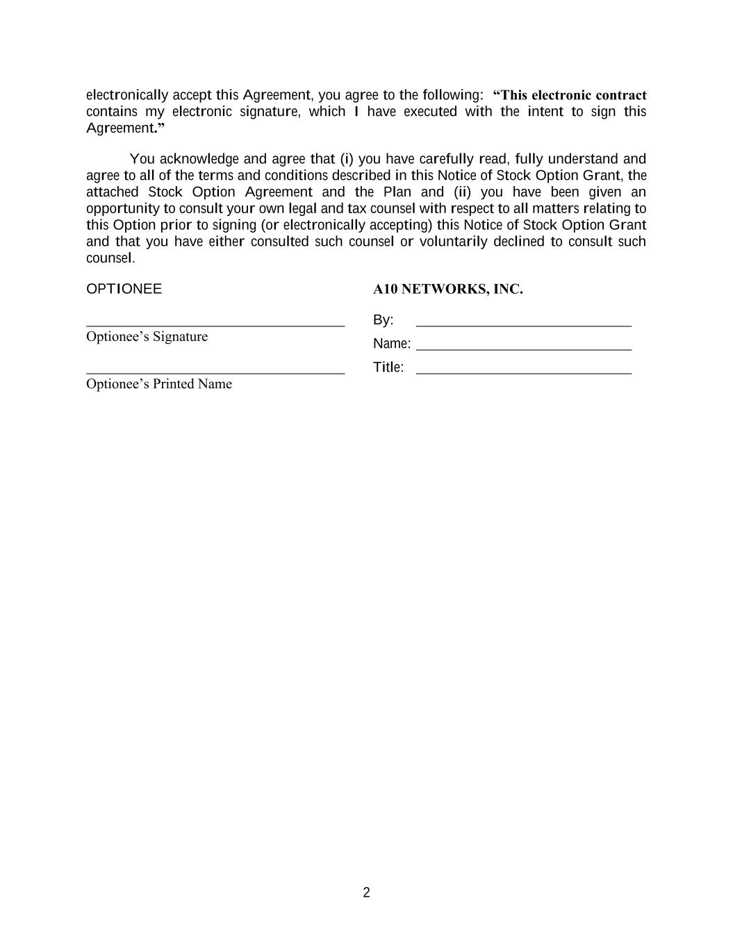 2 electronically accept this Agreement, you agree to the following: “This electronic contract contains my electronic signature, which I have executed with the intent to sign this Agreement.” You acknowledge and agree that (i) you have carefully read, fully understand and agree to all of the terms and conditions described in this Notice of Stock Option Grant, the attached Stock Option Agreement and the Plan and (ii) you have been given an opportunity to consult your own legal and tax counsel with respect to all matters relating to this Option prior to signing (or electronically accepting) this Notice of Stock Option Grant and that you have either consulted such counsel or voluntarily declined to consult such counsel. OPTIONEE Optionee’s Signature Optionee’s Printed Name A10 NETWORKS, INC. By: Name: Title: