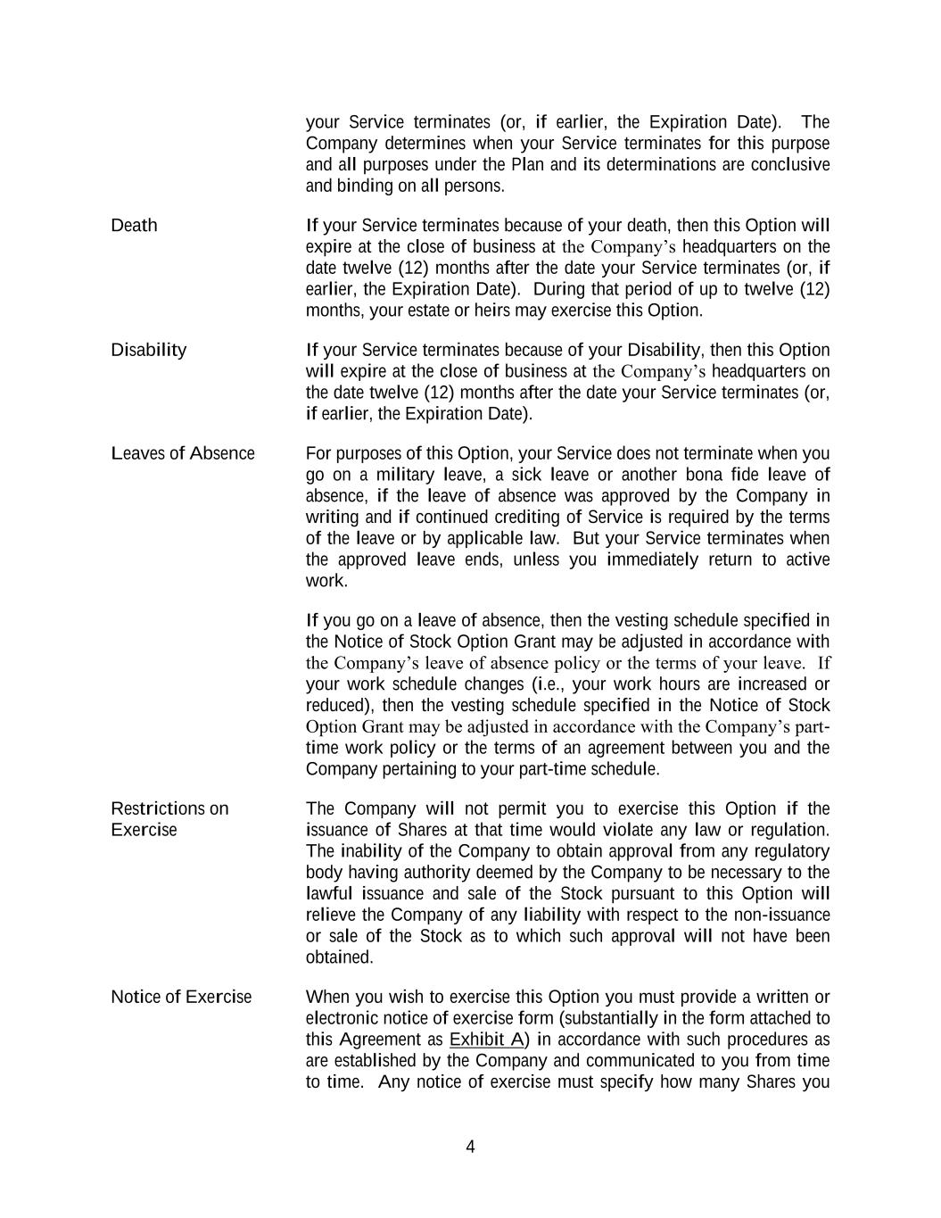 4 your Service terminates (or, if earlier, the Expiration Date). The Company determines when your Service terminates for this purpose and all purposes under the Plan and its determinations are conclusive and binding on all persons. Death If your Service terminates because of your death, then this Option will expire at the close of business at the Company’s headquarters on the date twelve (12) months after the date your Service terminates (or, if earlier, the Expiration Date). During that period of up to twelve (12) months, your estate or heirs may exercise this Option. Disability If your Service terminates because of your Disability, then this Option will expire at the close of business at the Company’s headquarters on the date twelve (12) months after the date your Service terminates (or, if earlier, the Expiration Date). Leaves of Absence For purposes of this Option, your Service does not terminate when you go on a military leave, a sick leave or another bona fide leave of absence, if the leave of absence was approved by the Company in writing and if continued crediting of Service is required by the terms of the leave or by applicable law. But your Service terminates when the approved leave ends, unless you immediately return to active work. If you go on a leave of absence, then the vesting schedule specified in the Notice of Stock Option Grant may be adjusted in accordance with the Company’s leave of absence policy or the terms of your leave. If your work schedule changes (i.e., your work hours are increased or reduced), then the vesting schedule specified in the Notice of Stock Option Grant may be adjusted in accordance with the Company’s part- time work policy or the terms of an agreement between you and the Company pertaining to your part-time schedule. Restrictions on Exercise The Company will not permit you to exercise this Option if the issuance of Shares at that time would violate any law or regulation. The inability of the Company to obtain approval from any regulatory body having authority deemed by the Company to be necessary to the lawful issuance and sale of the Stock pursuant to this Option will relieve the Company of any liability with respect to the non-issuance or sale of the Stock as to which such approval will not have been obtained. Notice of Exercise When you wish to exercise this Option you must provide a written or electronic notice of exercise form (substantially in the form attached to this Agreement as Exhibit A) in accordance with such procedures as are established by the Company and communicated to you from time to time. Any notice of exercise must specify how many Shares you