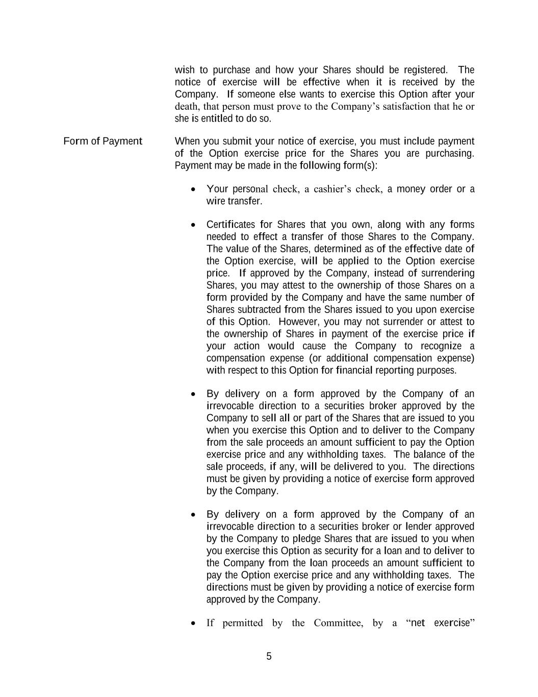 5 wish to purchase and how your Shares should be registered. The notice of exercise will be effective when it is received by the Company. If someone else wants to exercise this Option after your death, that person must prove to the Company’s satisfaction that he or she is entitled to do so. Form of Payment When you submit your notice of exercise, you must include payment of the Option exercise price for the Shares you are purchasing. Payment may be made in the following form(s): • Your personal check, a cashier’s check, a money order or a wire transfer. • Certificates for Shares that you own, along with any forms needed to effect a transfer of those Shares to the Company. The value of the Shares, determined as of the effective date of the Option exercise, will be applied to the Option exercise price. If approved by the Company, instead of surrendering Shares, you may attest to the ownership of those Shares on a form provided by the Company and have the same number of Shares subtracted from the Shares issued to you upon exercise of this Option. However, you may not surrender or attest to the ownership of Shares in payment of the exercise price if your action would cause the Company to recognize a compensation expense (or additional compensation expense) with respect to this Option for financial reporting purposes. • By delivery on a form approved by the Company of an irrevocable direction to a securities broker approved by the Company to sell all or part of the Shares that are issued to you when you exercise this Option and to deliver to the Company from the sale proceeds an amount sufficient to pay the Option exercise price and any withholding taxes. The balance of the sale proceeds, if any, will be delivered to you. The directions must be given by providing a notice of exercise form approved by the Company. • By delivery on a form approved by the Company of an irrevocable direction to a securities broker or lender approved by the Company to pledge Shares that are issued to you when you exercise this Option as security for a loan and to deliver to the Company from the loan proceeds an amount sufficient to pay the Option exercise price and any withholding taxes. The directions must be given by providing a notice of exercise form approved by the Company. • If permitted by the Committee, by a “net exercise”
